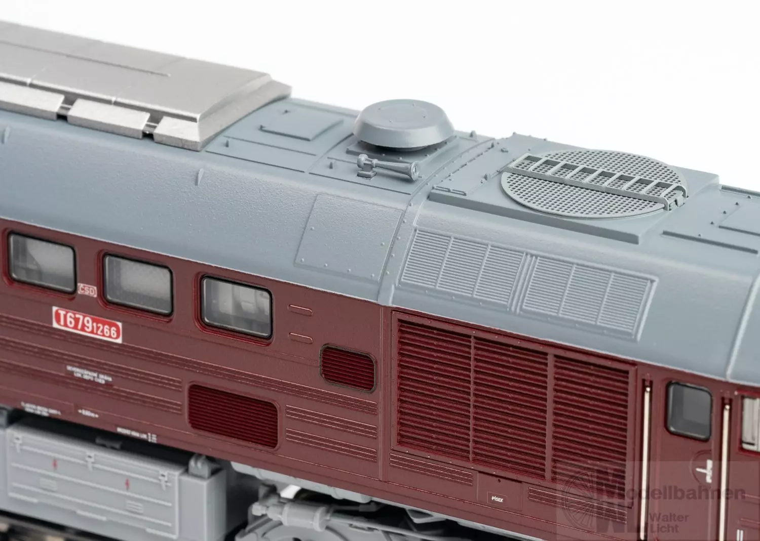 Vorbild: Diesellokomotive T 679.1266 der Tschechoslowakischen Staatsbahnen CSD, auch bekannt unter dem Spitznamen „Taigatrommel“. Mit Schalldämpfer sowjetischer Bauart, Ansauggitter mit waagerechten Lamellen und Kühlerlüfter mit Gitter. Betriebszustand um 1980.
