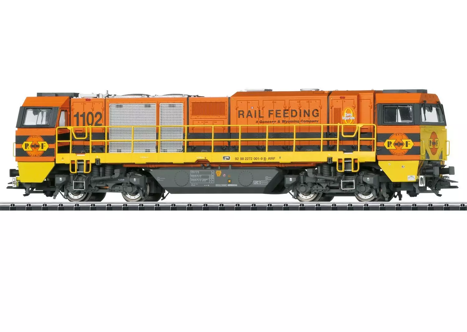 Vorbild: Schwere Diesellokomotive Vossloh G 2000 BB mit symmetrischem Führerhaus. Lokomotive der ATC AngelTrainsCargo, Antwerpen, vermietet an Rotterdam Rail Feeding (RRF). Gelb/orange Grundfarbgebung. Lok-Nummer 1102. Betriebszustand der Epoche VI.