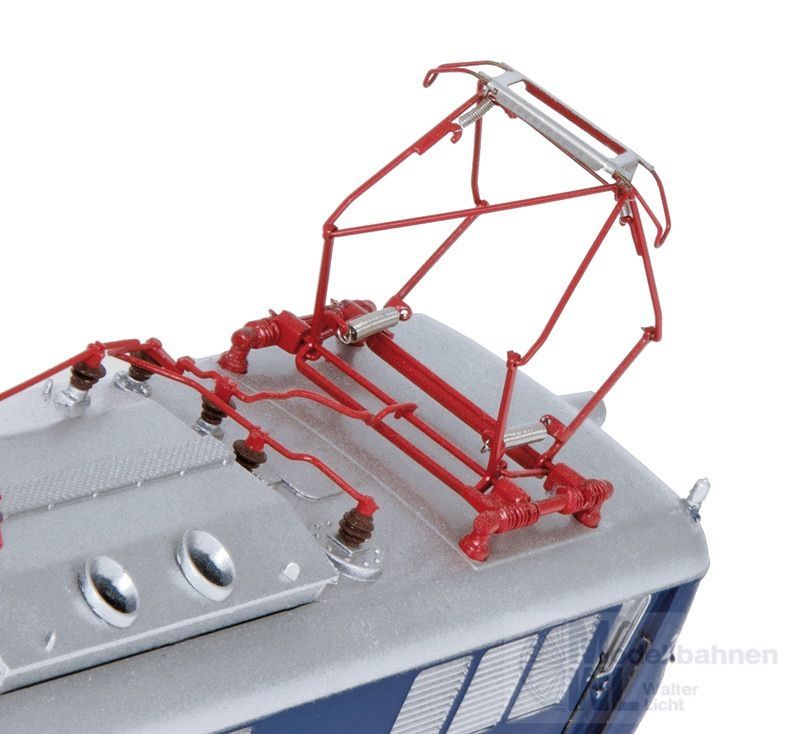 Lokmodell serienmäßig mit Heizscheiben und Indusi; teilweise aus Metalldruckguss. Silberfarbene Seitenlüfter und vorbildgerechte Dachstromabnehmer mit einer Diagonalstrebe und einem Zweifachschleifstück.