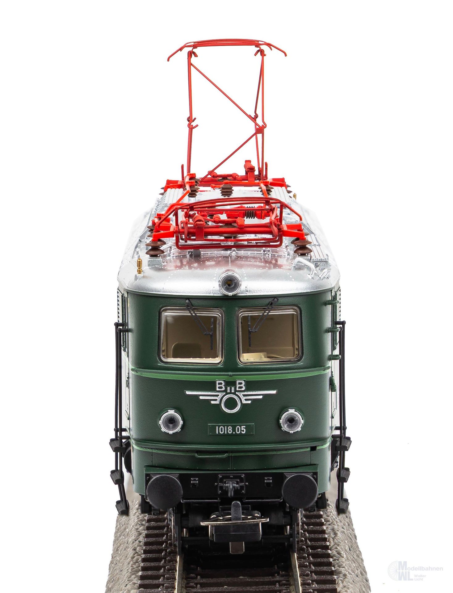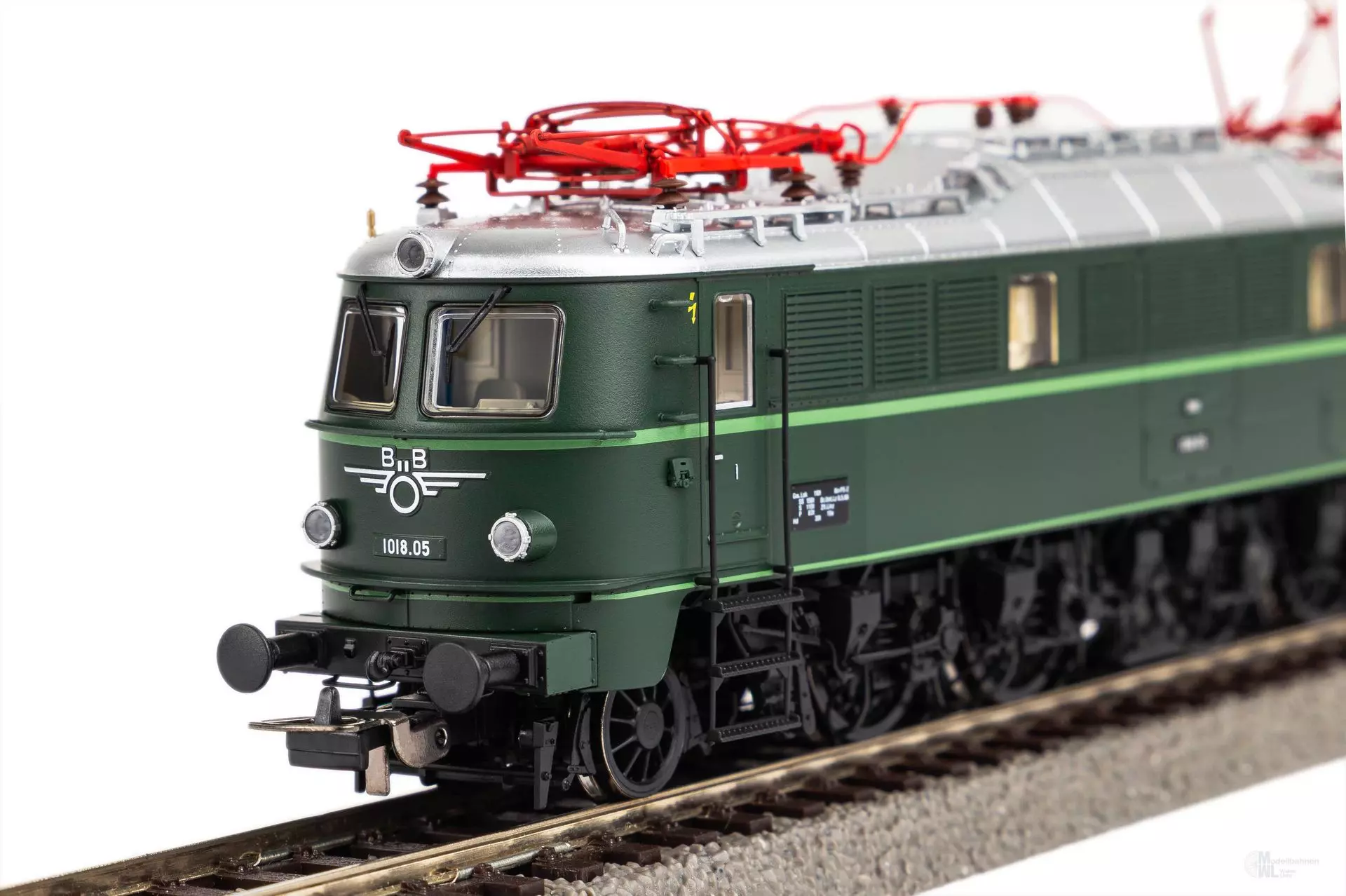Neuheit 2024: Formvariante der Rh 1018 der ÖBB in Epoche III. Das Modell erscheint als Variante ohne Schlussleuchte, mit zwölf Sandkästen und Pufferbohle in der Ursprungsausführung. Die tannengrüne Lackierung mit resedagrünem Zierstreifen prägt das äußere Erscheinungsbild, welches durch das gravierte ÖBBFlügelrad an der Front unterhalb der Frontfenster abgerundet wird. Dank PluX22Schnittstelle kann unkompliziert ein Digitaldecoder eingebaut werden. Zudem ist das Modell für die einfache Nachrüstung von Sound mit einem großen Lautsprecher vorbereitet.