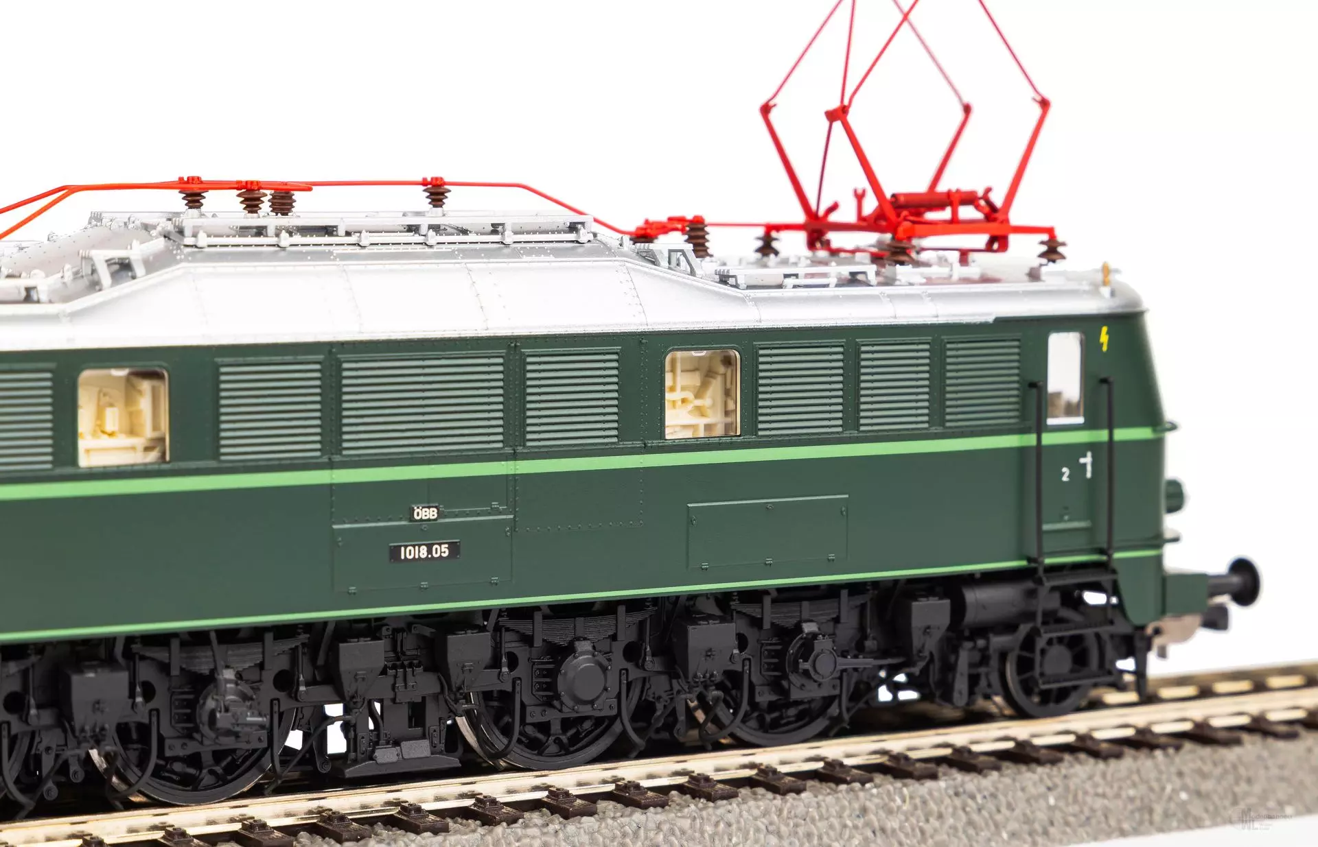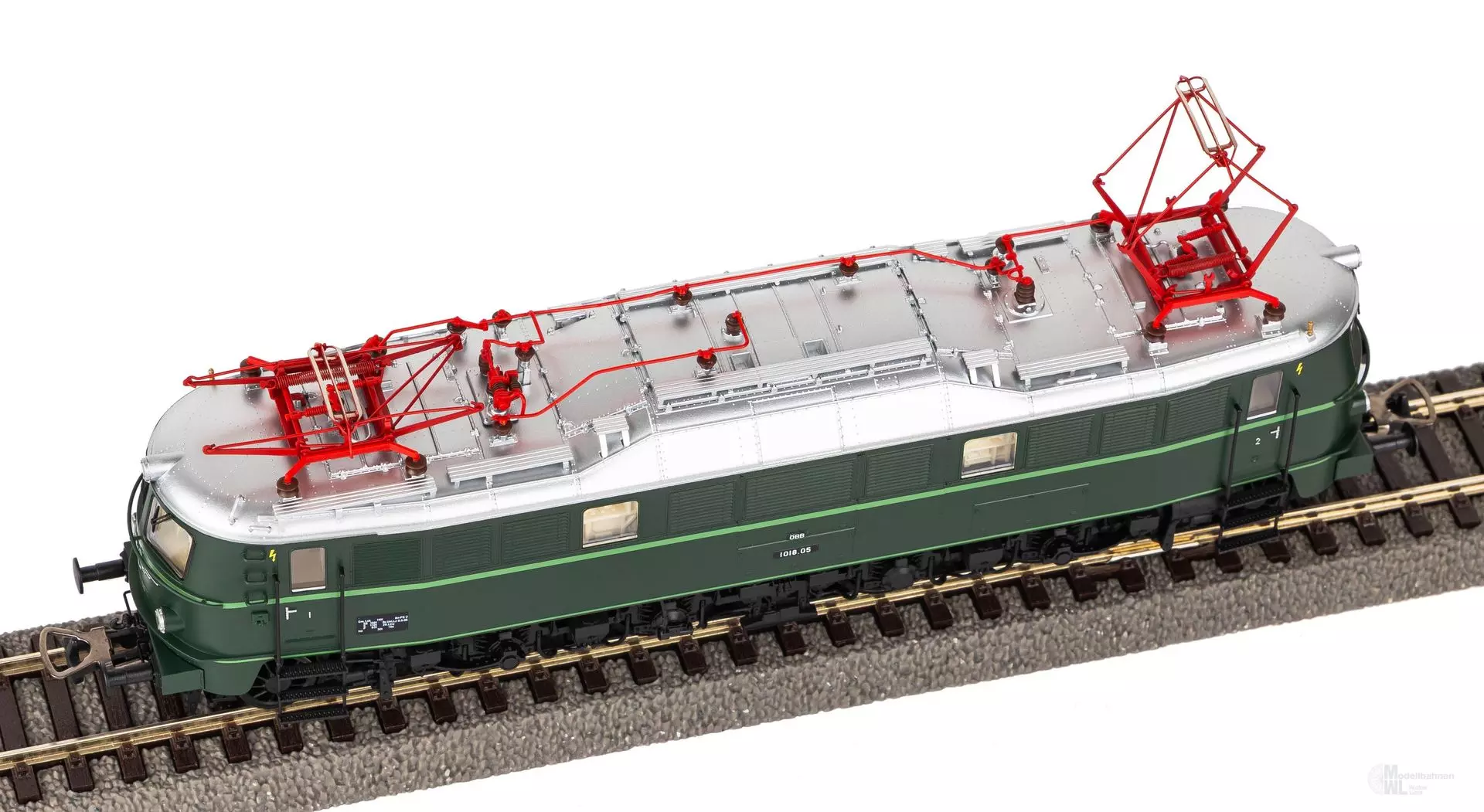 Neuheit 2024: Formvariante der Rh 1018 der ÖBB in Epoche III. Das Modell erscheint als Variante ohne Schlussleuchte, mit zwölf Sandkästen und Pufferbohle in der Ursprungsausführung. Die tannengrüne Lackierung mit resedagrünem Zierstreifen prägt das äußere Erscheinungsbild, welches durch das gravierte ÖBBFlügelrad an der Front unterhalb der Frontfenster abgerundet wird. Das Modell ist ab Werk mit einem PSD XP SoundDecoder mit größtmöglichem Lautsprecher ausgestattet und verfügt über digital schaltbare Beleuchtungen im Maschinenraum und den Führerständen.