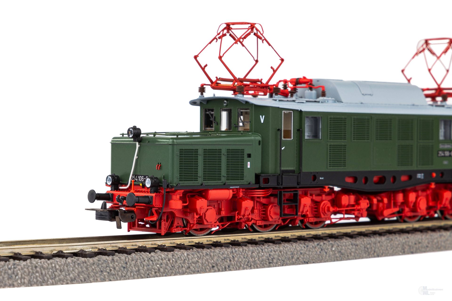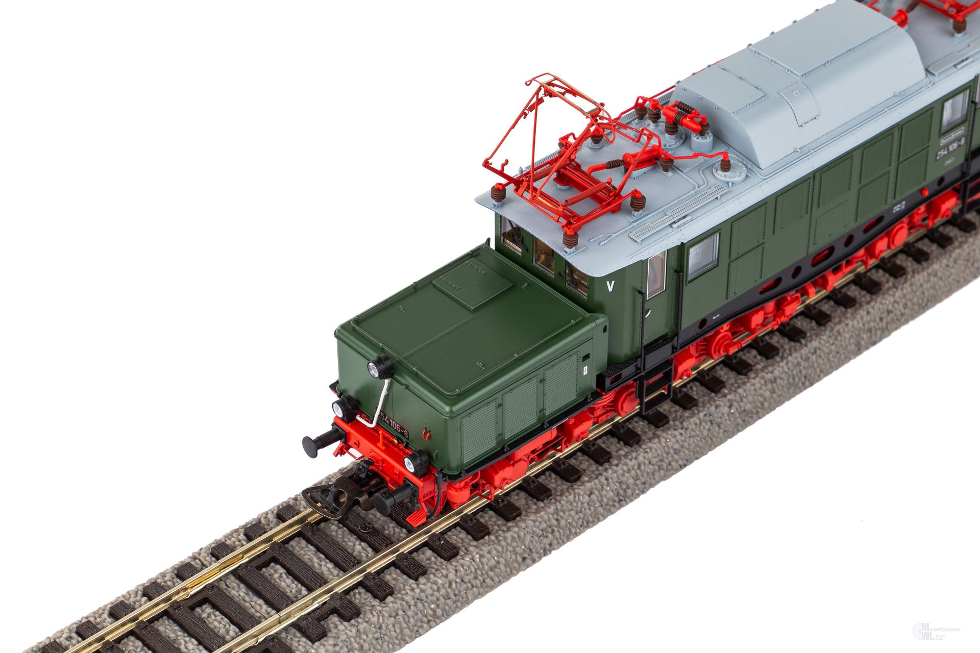 Neuheit 2023: Formvariante der BR E 94 in der Ausführung als BR 254 der DR in Epoche IV. Ab 1970 wurden die Maschinen der Baureihe E 94 bei der DR unter der Nummer 254 geführt. Im Laufe der darauffolgenden Jahre wurden einige Veränderungen an den Lokomotiven vorgenommen. So erhielten Sie neue Stromabnehmer vom Typ RBS 58 und die Drehgestelle wurden rot gestrichen. Diese und weitere Besonderheiten spiegelt auch das PIKO Modell vorbildgetreu wieder.