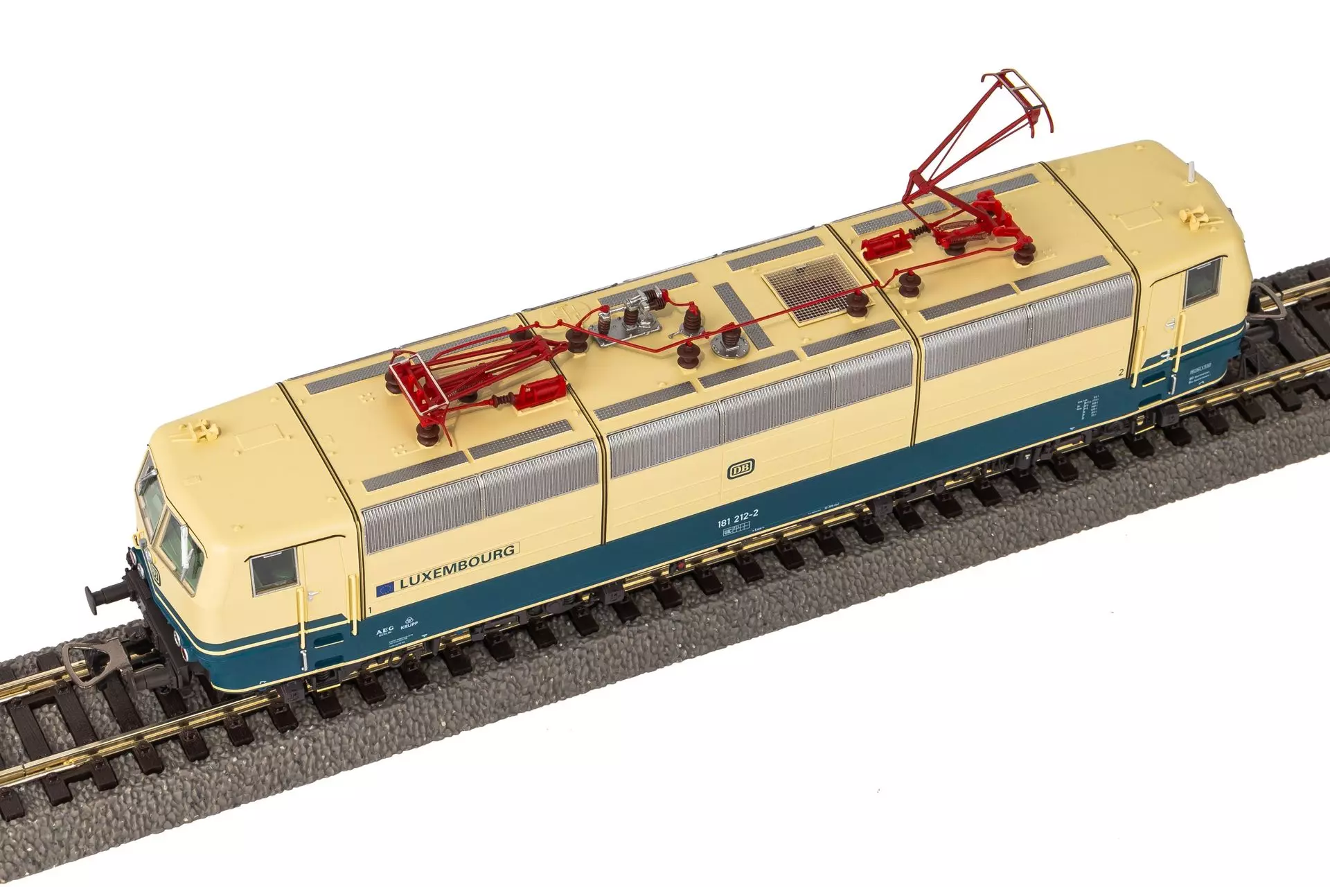 Neuheit 2024: Variante der BR 181.2 der DB mit Bedruckung Luxembourg in Epoche IV. Das PIKO Modell der wichtigen MehrsystemLokbaureihe 181.2 zeigt alle relevanten Details seines Vorbildes auf und überzeugt durch feinste Lackierung und Bedruckung, erhabene Namensschilder auf den Seiten, extra angesetzte Frontgriffe und Türgriffstangen, scharf gravierte Drehgestellblenden, feine Isolatoren und Stromabnehmer mit unterschiedlichen Schleifstücken. Die Beleuchtung erfolgt mittels LEDs. Die serienmäßig eingebaute Führerstands und Maschinenraumbeleuchtungen sind hierbei wie die fahrtrichtungsabhängig funktionierenden Schlusslichter mit PluX22 Decoder digital schaltbar. Ein starker fünfpoliger Motor mit Schwungmassen, der alle vier Achsen antreibt, sorgt für hervorragende Fahreigenschaften. Das schwere PIKO Modell verfügt über zwei Haftreifen und einen schweren Zinkdruckgussrahmen für große Zugkräfte. Die PIKO 181.2 besitzt ab Werk einen passenden PSD XP SoundDecoder mit größtmöglichem Lautsprecher.
