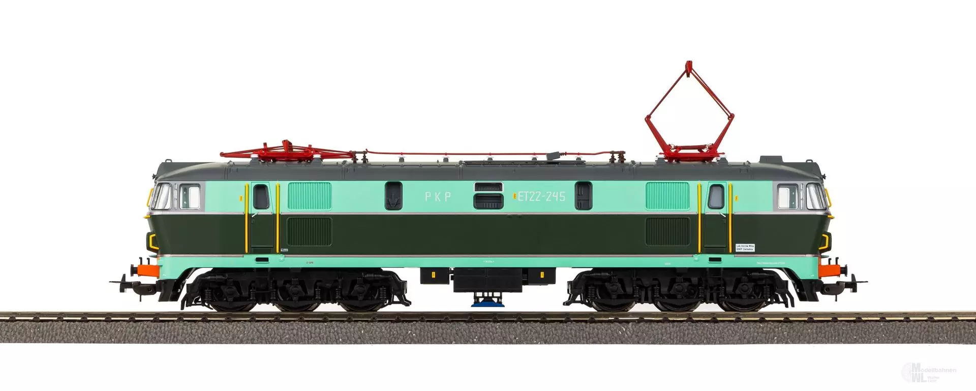 Neuheit 2023: Druckvariante der ET22 PKP im Design der Epoche IV. Die PIKO ET22 besitzt als Highlights feinste Lackierung und Bedruckung, filigrane Stromabnehmer, exakt umgesetzte Lampenbereiche, digital schaltbare Führerstandsbeleuchtungen und fahrtrichtungsabhängig funktionierende Front- und Schlusslichter. Die Beleuchtung erfolgt mittels LEDs. Das mit einem Zinkdruckgussrahmen versehene Modell verfügt über einen fünfpoligen Motor mit Schwungmassen für hervorragende Fahreigenschaften und zwei Haftreifen für hohe Zugkräfte, die auf den innenliegenden Achsen beider Drehgestelle diagonal angeordnet sind. Das Modell besitzt in der Soundvariante werkseitig einen PluX22-SoundDecoder. Ansteckbare Bremsschlauchattrappen liegen dem Modell der ET22 bei.