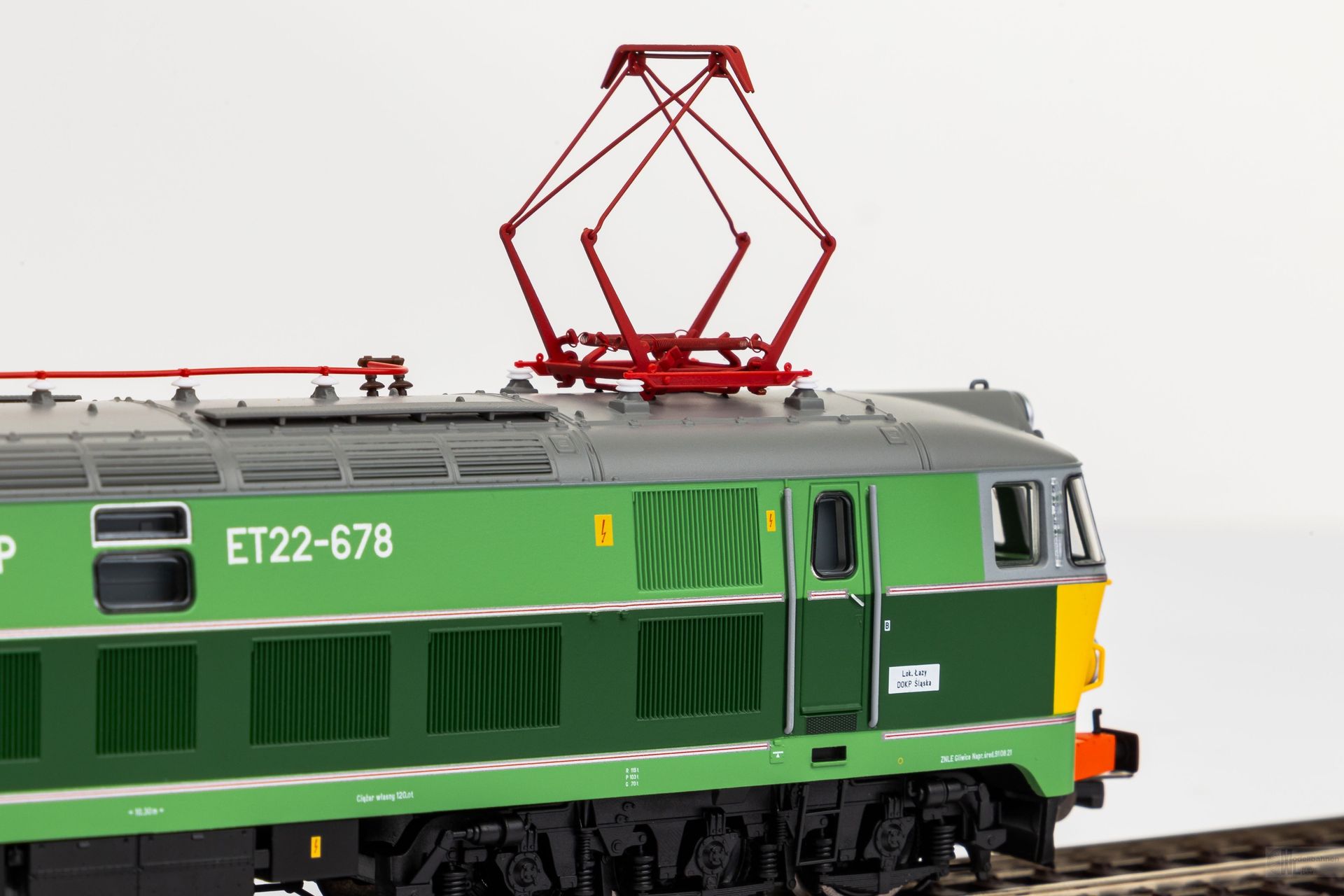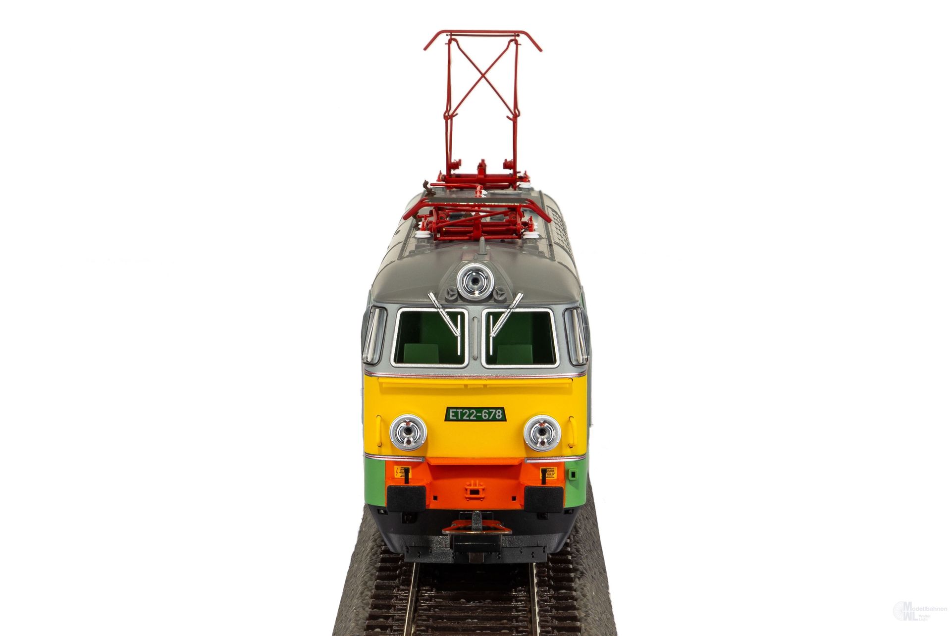 Neuheit 2023: Druckvariante der ET22 PKP im Design der Epoche V. Die PIKO ET22 besitzt als Highlights feinste Lackierung und Bedruckung, filigrane Stromabnehmer, exakt umgesetzte Lampenbereiche, digital schaltbare Führerstandsbeleuchtungen und fahrtrichtungsabhängig funktionierende Front- und Schlusslichter. Die Beleuchtung erfolgt mittels LEDs. Das mit einem Zinkdruckgussrahmen versehene Modell verfügt über einen fünfpoligen Motor mit Schwungmassen für hervorragende Fahreigenschaften und zwei Haftreifen für hohe Zugkräfte, die auf den innenliegenden Achsen beider Drehgestelle diagonal angeordnet sind. Die einfache Nachrüstung von Sound und größtmöglichem Lautsprecher ist auf der aufgeräumt konstruierten Platine mit PluX22-Schnittstelle selbstverständlich vorbereitet. Ansteckbare Bremsschlauchattrappen liegen dem Modell der ET22 bei.