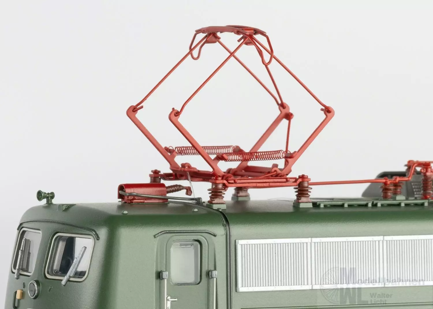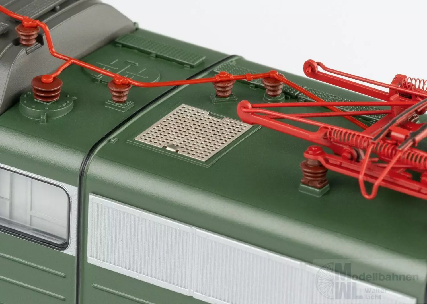 Modell: Mit Digital-Decoder und umfangreichen Geräuschfunktionen. Geregelter Hochleistungsantrieb mit Schwungmasse, zentral eingebaut. Jeweils zwei Achsen in jedem Drehgestell über Kardan angetrieben. Haftreifen. Fahrtrichtungsabhängig wechselndes Dreilicht-Spitzensignal und zwei rote Schlusslichter konventionell in Betrieb, digital schaltbar. Spitzensignal an Lokseite 2 und 1 jeweils digital separat abschaltbar. Doppel-A-Licht-Funktion. Führerstandsbeleuchtung mit der Fahrtrichtung wechselnd und Maschinenraumbeleuchtung digital schaltbar. Zusätzlich kann eine Anfahrlampe fahrtrichtungsabhängig digital geschaltet werden. Beleuchtung mit wartungsfreien warmweißen und roten Leuchtdioden (LED). Detailliert ausgeführte Dachaufbauten mit neu konstruierten Stromabnehmern der Bauart DBS 54. Stromabnehmer digital heb- und senkbar. Viele separat angesetzte Teile wie Radimitationen, Griffstangen, Sandkästen, UIC-Steckdosen und Dachleitungen. Pufferhöhe nach NEM. Bremsleitungen, Schraubenkupplungen und verschiedene Steckdosen liegen als separat ansteckbare Teile bei. Länge über Puffer ca. 22,4 cm.