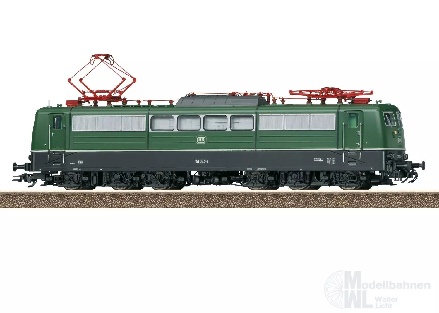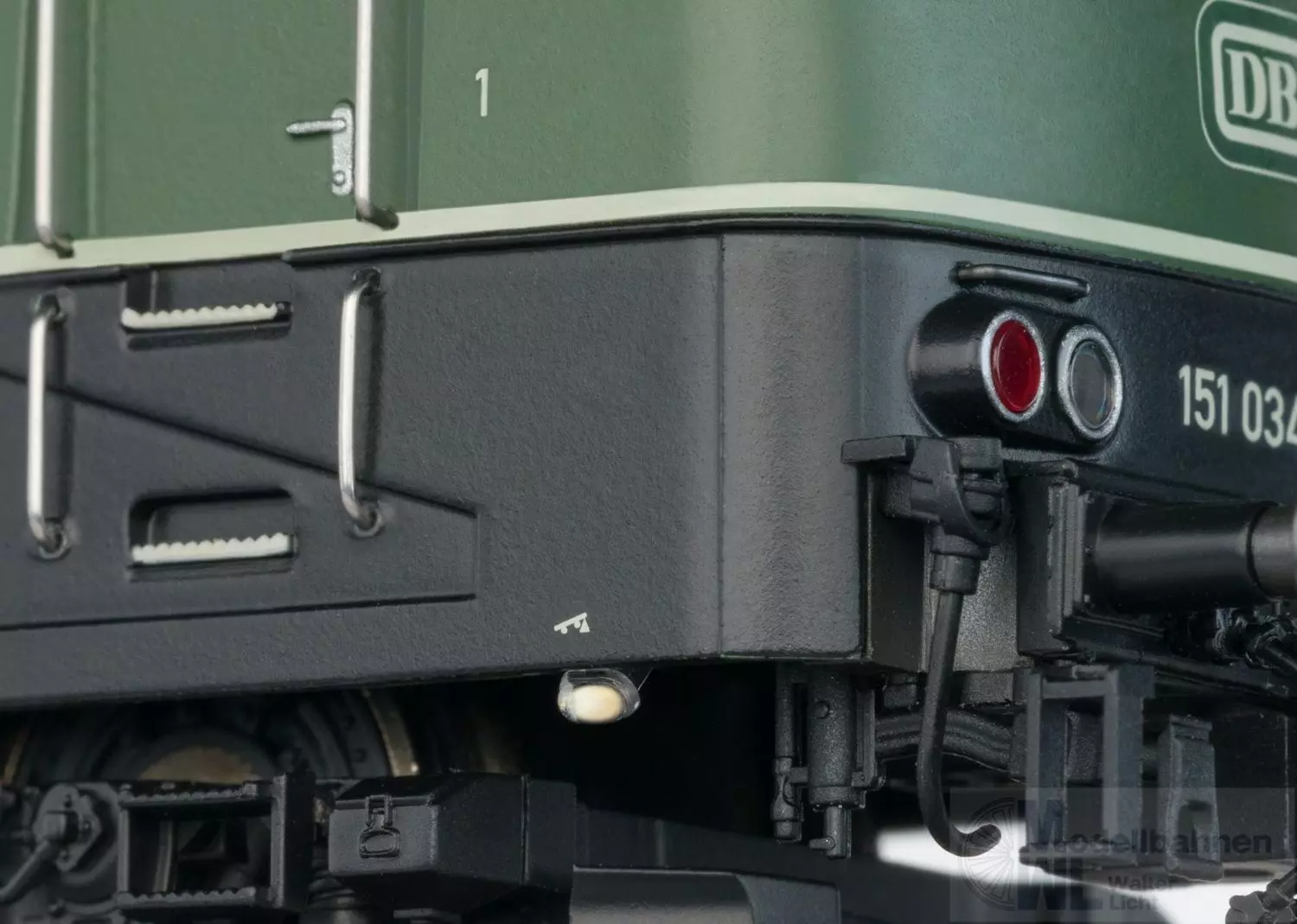 Vorbild: Elektrolokomotive Baureihe 151 der Deutschen Bundesbahn (DB). Chromoxidgrüne Grundfarbgebung. Betriebsnummer 151 034-6. Betriebszustand ab 1974.