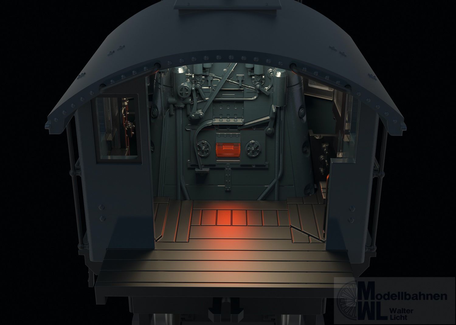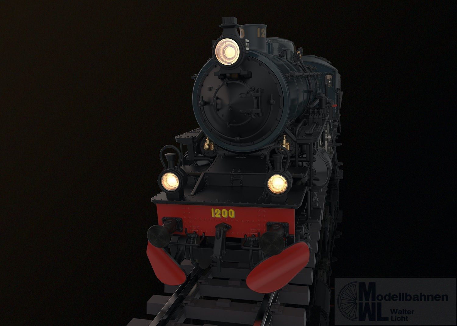 Modell: Lokomotive und Tender weitgehend aus Metall. Mit Digital-Decoder mfx+ und umfangreichen Licht- und Geräuschfunktionen. Geregelter Hochleistungsantrieb mit Schwungmasse im Kessel. Eine Achse angetrieben, zwei Achsen über Kuppelstangen angetrieben. Haftreifen. Fahrtrichtungsabhängig wechselndes Zweilicht-Spitzensignal konventionell in Betrieb, digital schaltbar. Das Notlicht an der Rauchkammertür ist separat digital schaltbar. Zusätzlich sind die Führerstandbeleuchtung und das Feuerflackern in der Feuerbüchse separat digital schaltbar. Beleuchtung mit wartungsfreien warmweißen und roten Leuchtdioden (LED). Serienmäßig eingebauter Rauchsatz konventionell in Betrieb, digital schaltbar. Verstellbare Kupplung mit Kinematik zwischen Lok und Tender. Am Tender kinematikgeführte Kurzkupplung mit NEM-Schacht. Befahrbarer Mindestradius 360 mm. Diverse Ansteckteile wie bspw. Aufstiegstritte, Bremsschläuche, Rohrleitungen und Schraubenkupplungsimitation liegen bei.