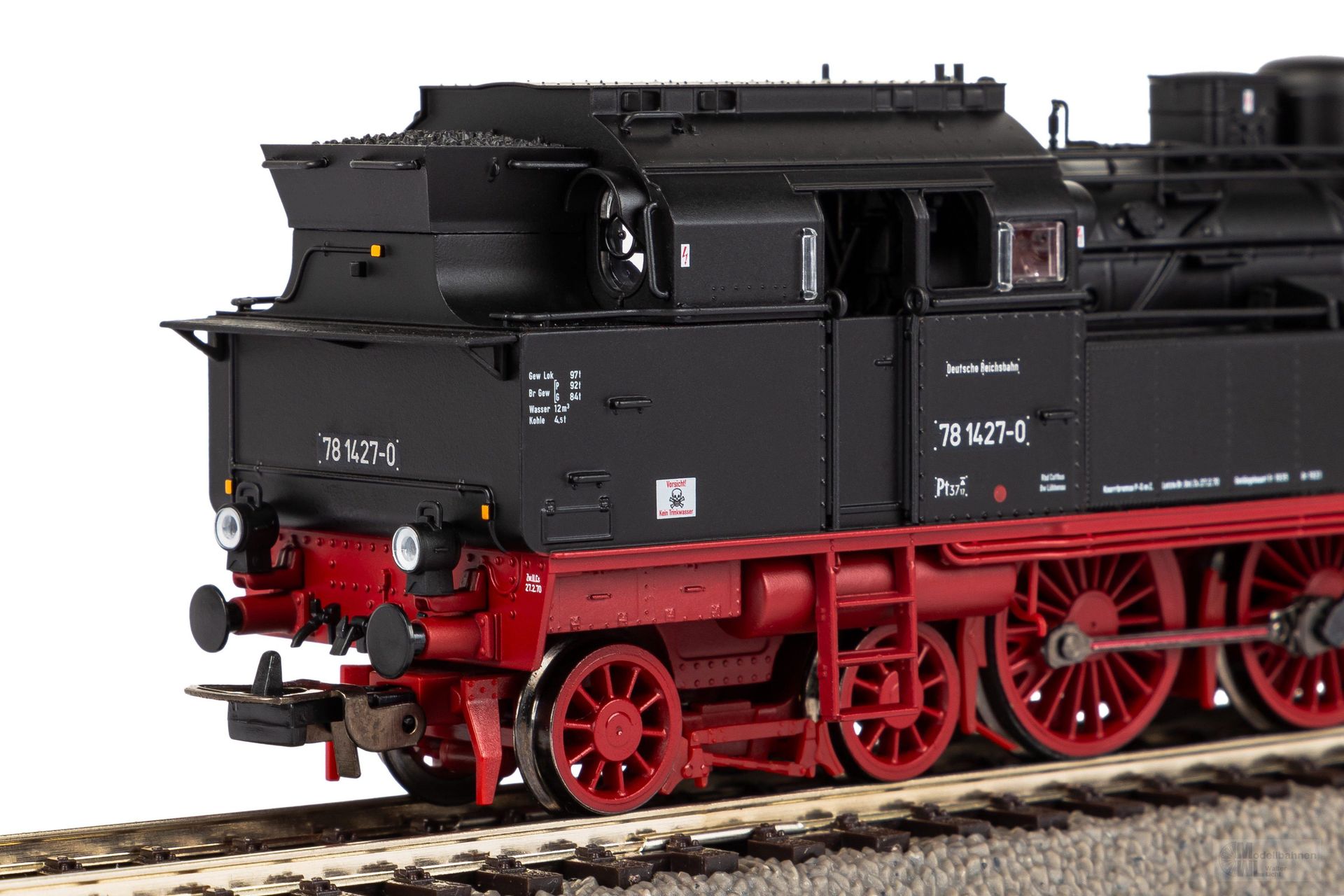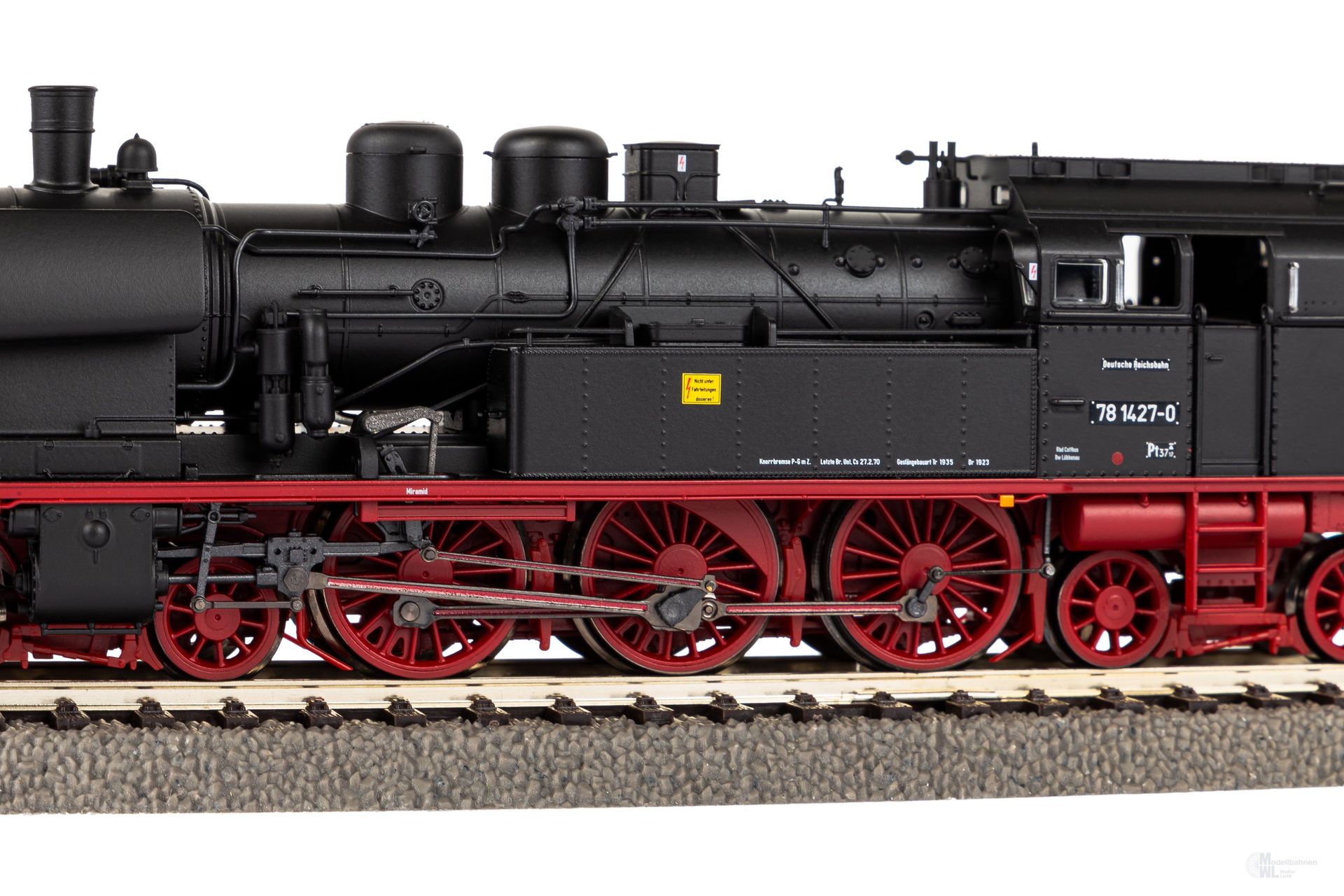 Neuheit 2023: Die BR 78 von PIKO mit vorbildgetreuer Gestaltung und Beschriftung der DR in Epoche IV. Nahezu alle Leitungen wurden freistehend ausgeführt, Führerhaus, Wasserkästen und Rauchkammer zieren feinste Nachbildungen der Nietköpfe. Für ausgezeichnete Fahreigenschaften sorgt der fünfpolige PIKO-Motor mit Schwungmasse. Zusatzgewichte im Kessel und zwei Haftreifen sorgen für eine hohe Zugkraft. Die Soundvariante verfügt ab Werk über einen PIKO Sound-Decoder inkl. Lautsprecher sowie einen integrierten Rauchsatz. Für authentische Betriebsstimmung sorgt die fahrtrichtungsabhängige Beleuchtung in LED-Ausführung.