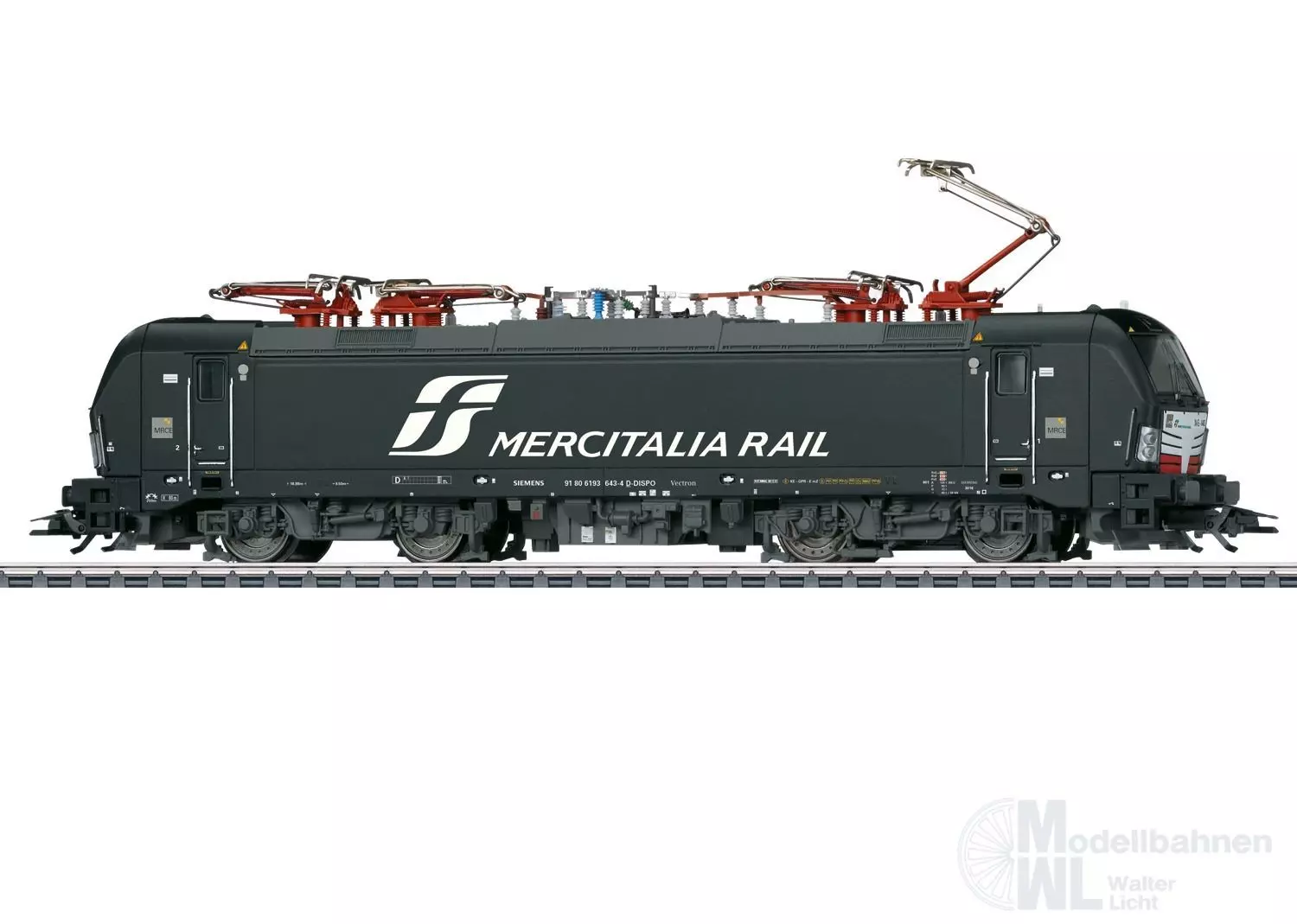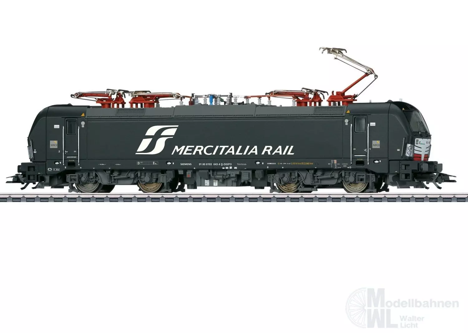 Vorbild: Elektrolokomotive BR 193 (Vectron) der Siemens Dispo GmbH, vermietet an MRCE, untervermietet an Mercitalia Rail S.r.l. (Rom). Loknummer X4 E – 643. Betriebszustand 2016.
