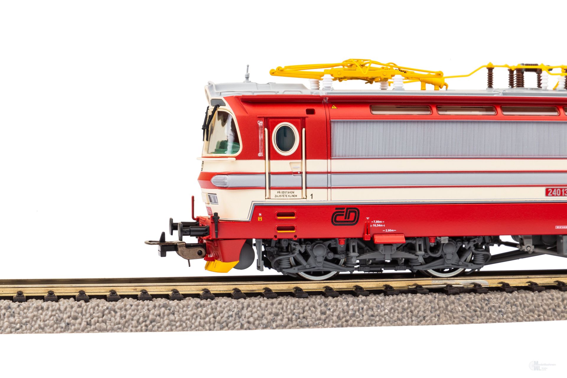 Neuheit 2023: Die formschöne „Laminátka“ in der Ausführung als BR 240 der ?D in Epoche V. Die Anmut der formschönen Maschinen vom Typ Škoda 47E „Laminátka“ wurde hervorragend in den Maßstab 1:87 übertragen und ein absolut stimmiges Gesamtbild geschaffen. Die vielen attraktiven Details, wie etwa die Oberlichter im Maschinenraum, wurden elegant umgesetzt und die stark gliedernde Linienführung des Lokkastens durch scharfe Gravuren visualisiert. Die farbenfrohe Livree des Vorbilds, samt dynamisch wirkender Zierelemente, steht der Lok auch in 1:87 dank aufwendiger Lackierung und Bedruckung ausgezeichnet. Angetrieben wird die Lok durch einen fünfpoligen Motor, dessen Stromsystem: Gleichmäßiger Lauf durch zwei Schwungmassen perfektioniert wird. Eine mit der Fahrtrichtung Stromsystem: Wechselnde Beleuchtung in Rot und Weiß ist selbstverständlich vorhanden und in zeitgemäßer LED-Technik ausgeführt. Die Elektrolok verfügt in der Soundversion ab Werk über einen passenden PIKO Sound-Decoder inkl. Lautsprecher.