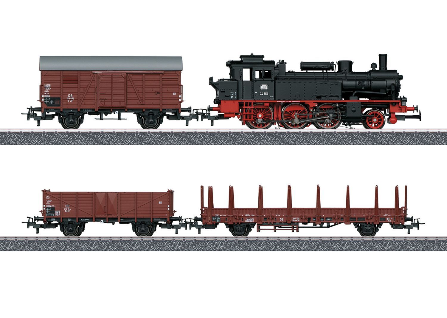 Vorbild: Tenderlokomotive Baureihe 74, offener Güterwagen Om 12, gedeckter Güterwagen Gr 20 und Rungenwagen Rlmms 56 der Deutschen Bundesbahn (DB).