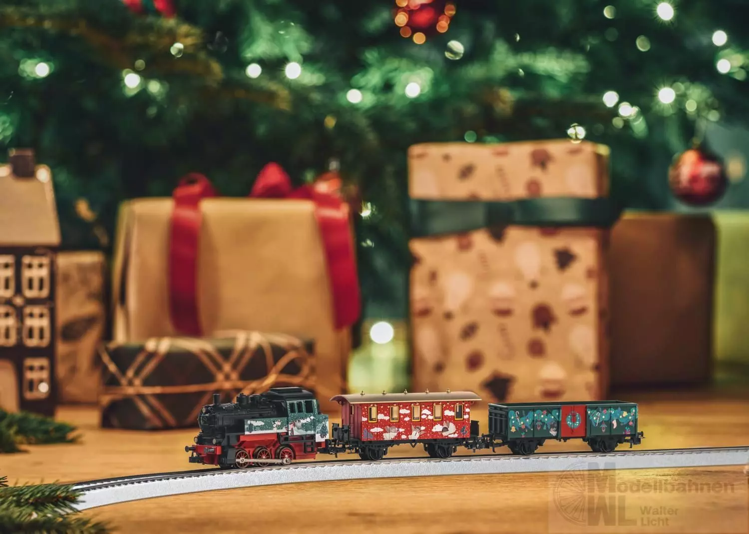 Zug in einer ansprechenden Weihnachtsgestaltung.