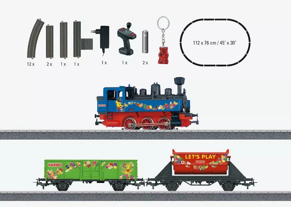Zug in einer ansprechend bunten HARIBO-Gestaltung.Robuster Zug - bestens geeignet für Kinder ab 6 Jahren.Ergonomischer Power Control Stick zur Steuerung von bis zu 4 Lokomotiven sowie 5 Funktionen.Freie Beweglichkeit rund um die Anlage durch das kabellose Infrarot-Steuergerät.Aufbaufreundliche C-Gleis-Anlage.
