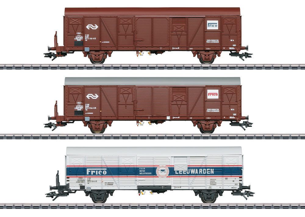 Vorbild: Drei Kühlwagen Standardtyp Gbs 14 m der Firma Frico, eingestellt bei den Niederländischen Eisenbahnen (NS). Bauart mit Bretterwänden.