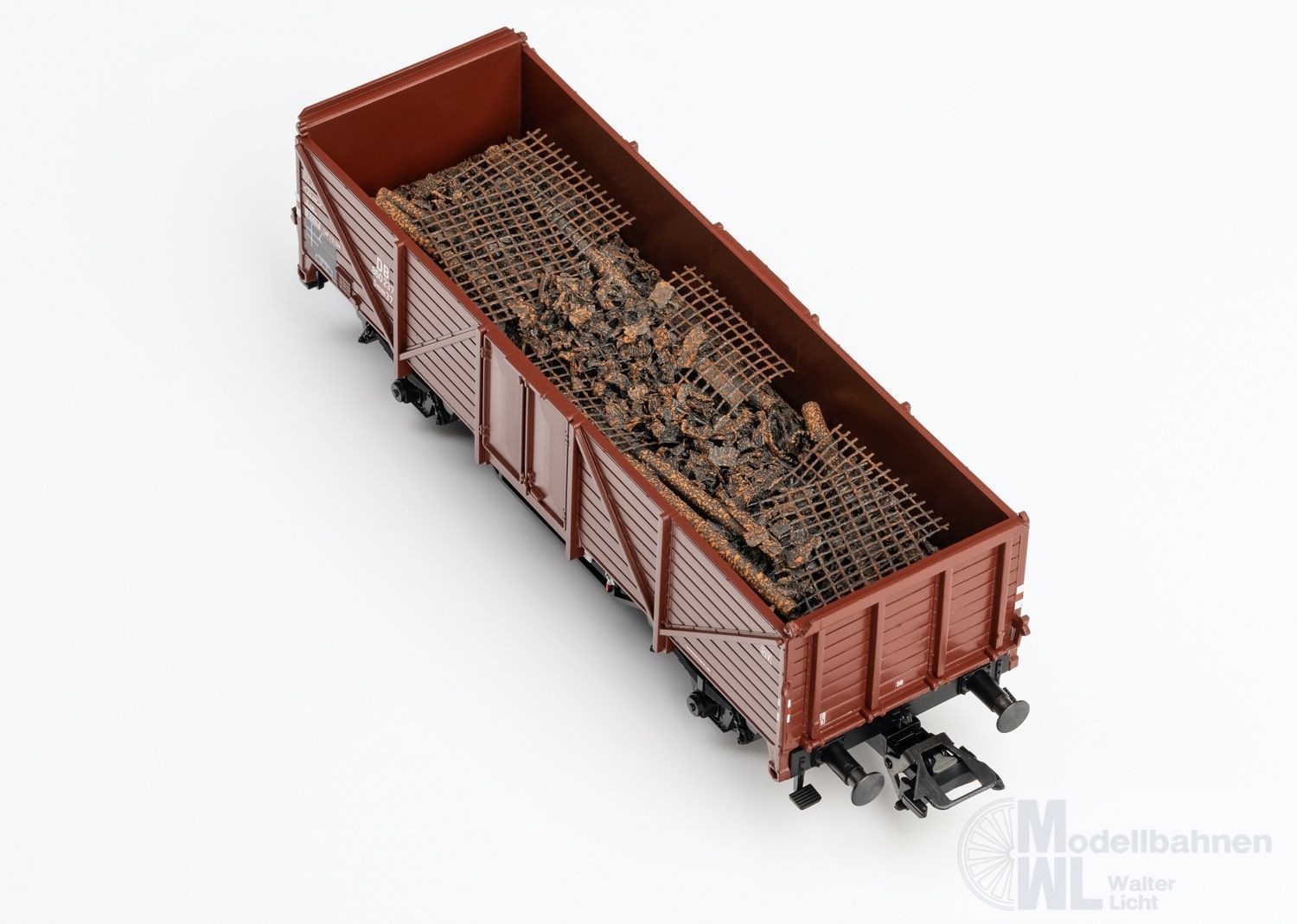 Modell: Lokalbahn-Gepäckwagen mit vielen angesetzten Details. Gedeckter Güterwagen mit Tonnendach und plattenbekleideten Seitenwänden. Offener Güterwagen mit hölzernen Bordwänden und doppelflügeligen Seitenwandtüren. Mit Ladeguteinsatz zur Darstellung von Schrott. Rungenwagen mit separat angesetztem Sprengwerk. Mit Holzstämmen beladen. Separat ansteckbare Rungen liegen bei. Alle Wagen einzeln verpackt in zusätzlicher Umverpackung. Gesamtlänge über Puffer ca. 50,5 cm. Wechselstromradsatz E36667900 (Gepäckwagen), E700150.