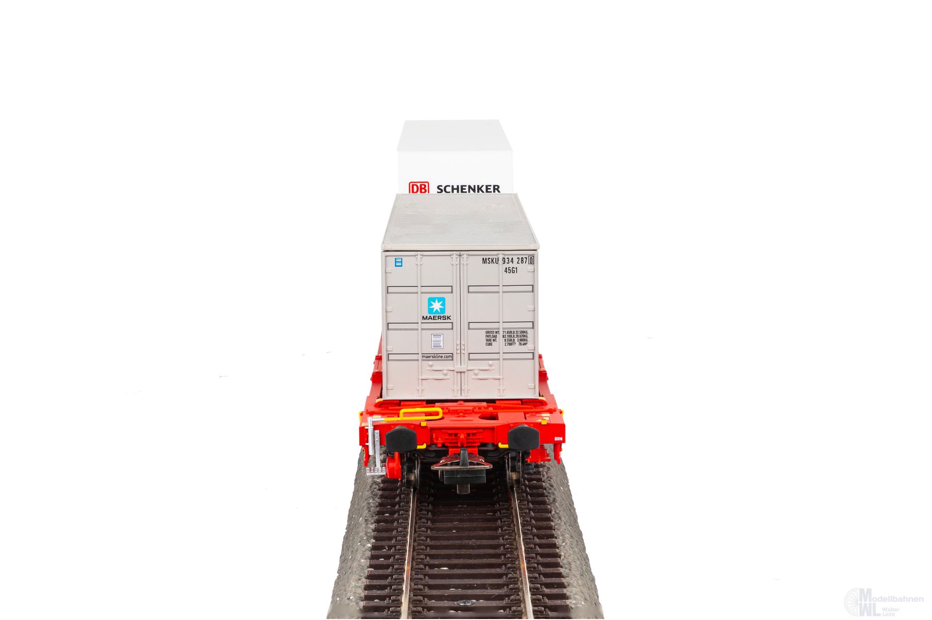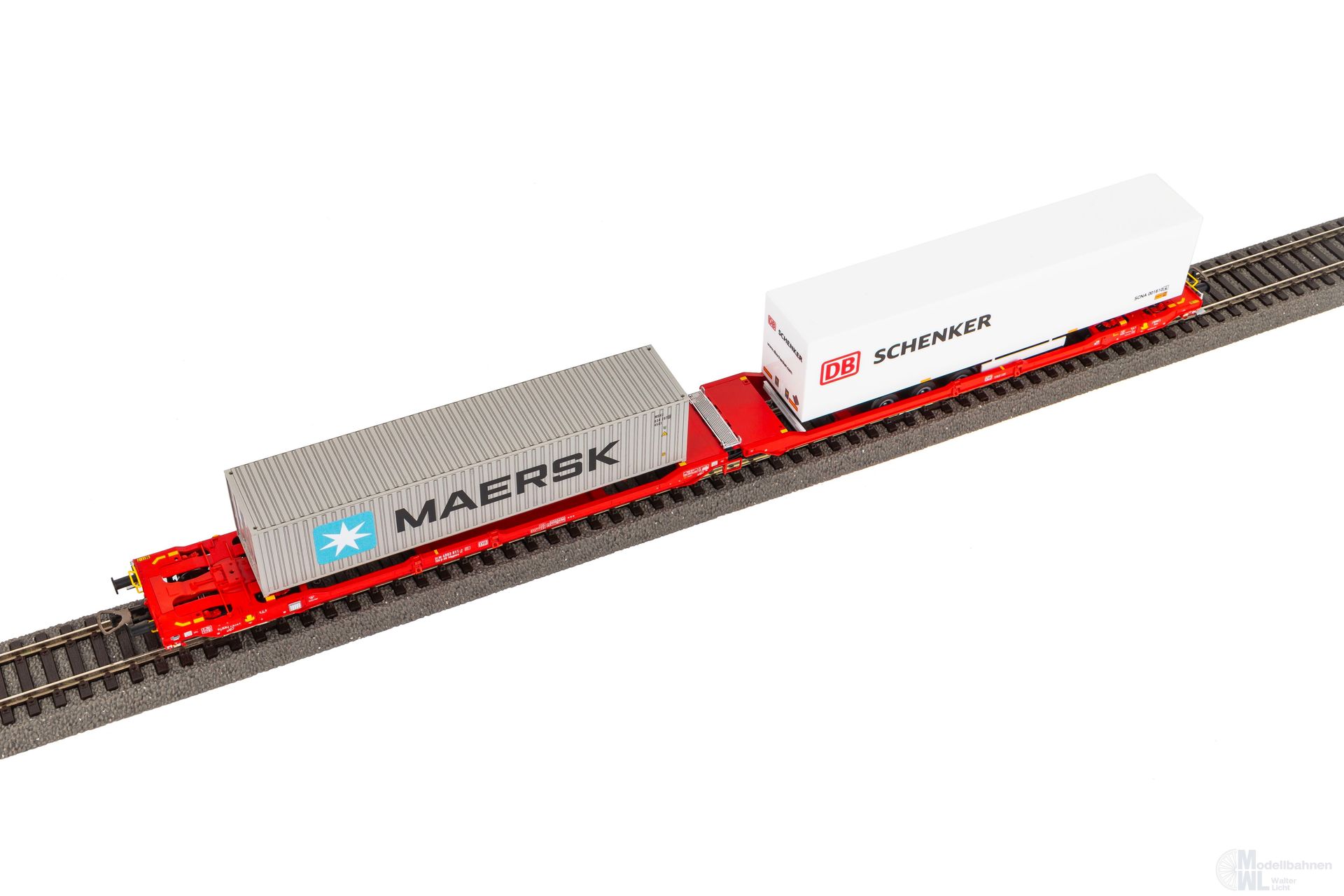 Neuheit 2024: Taschenwagen T3000e der DB AG in Epoche VI. Das Modell ist mit einem Container von MAERSK und einem Auflieger von DB Schenker ausgestattet.