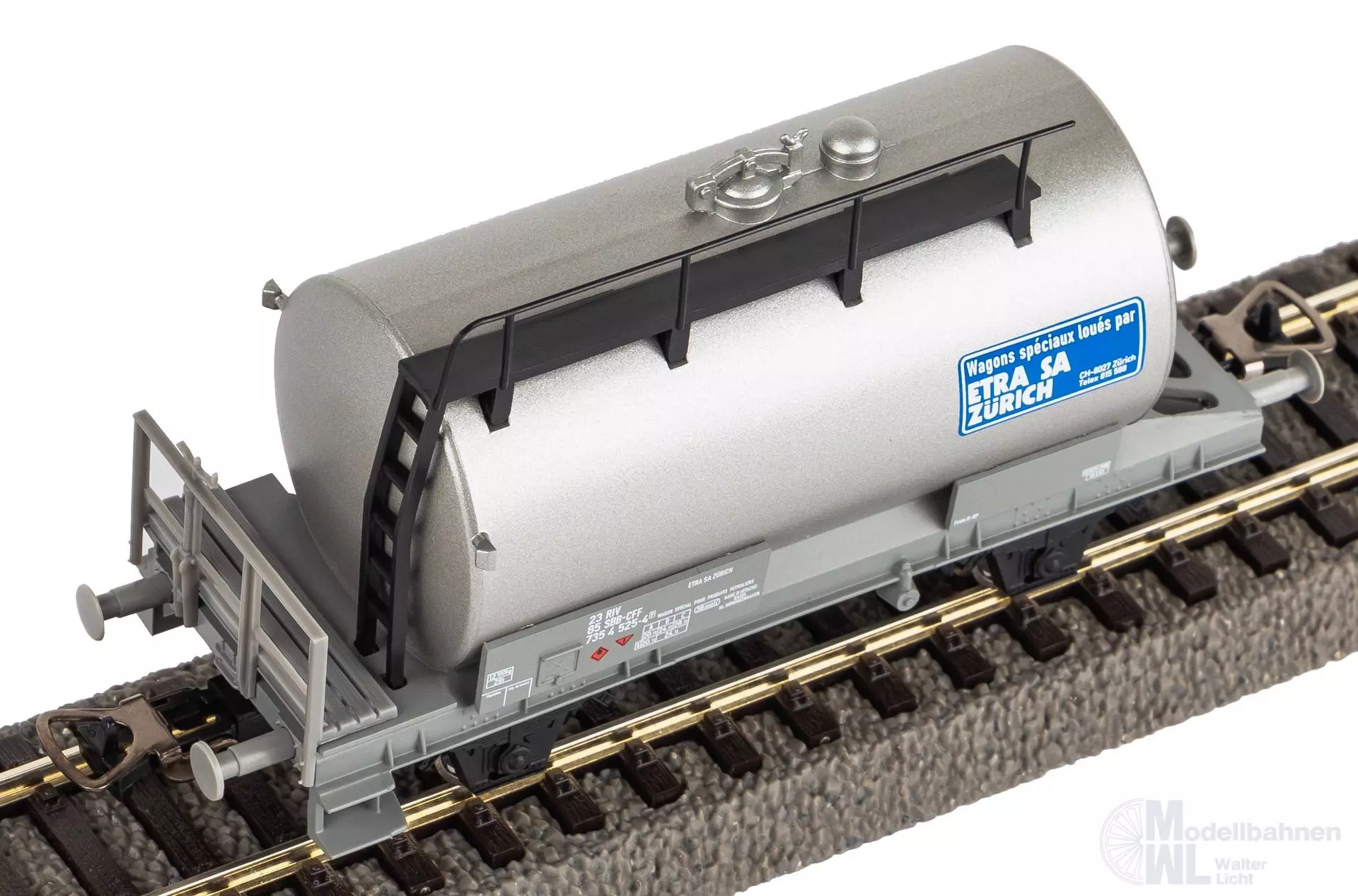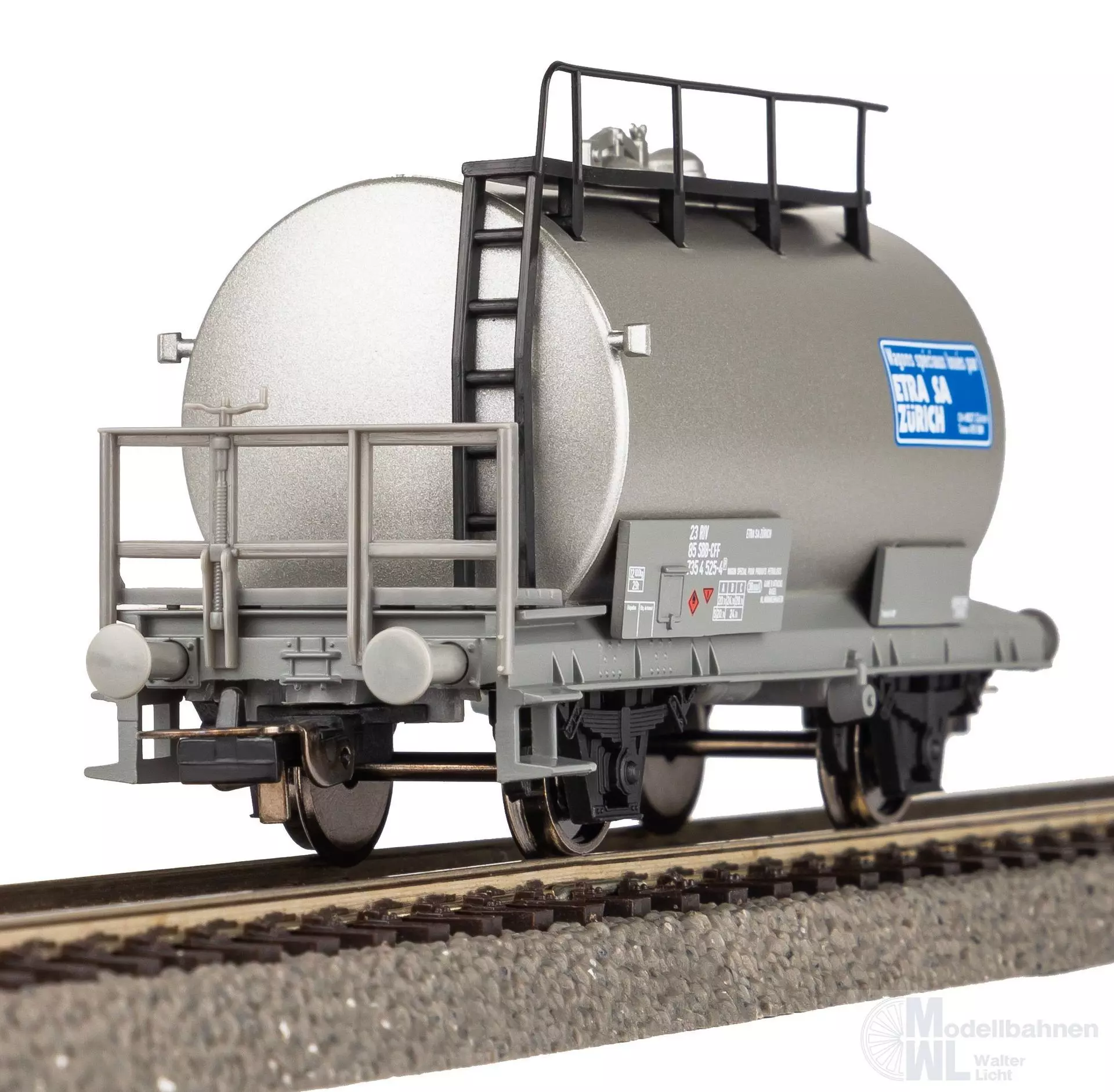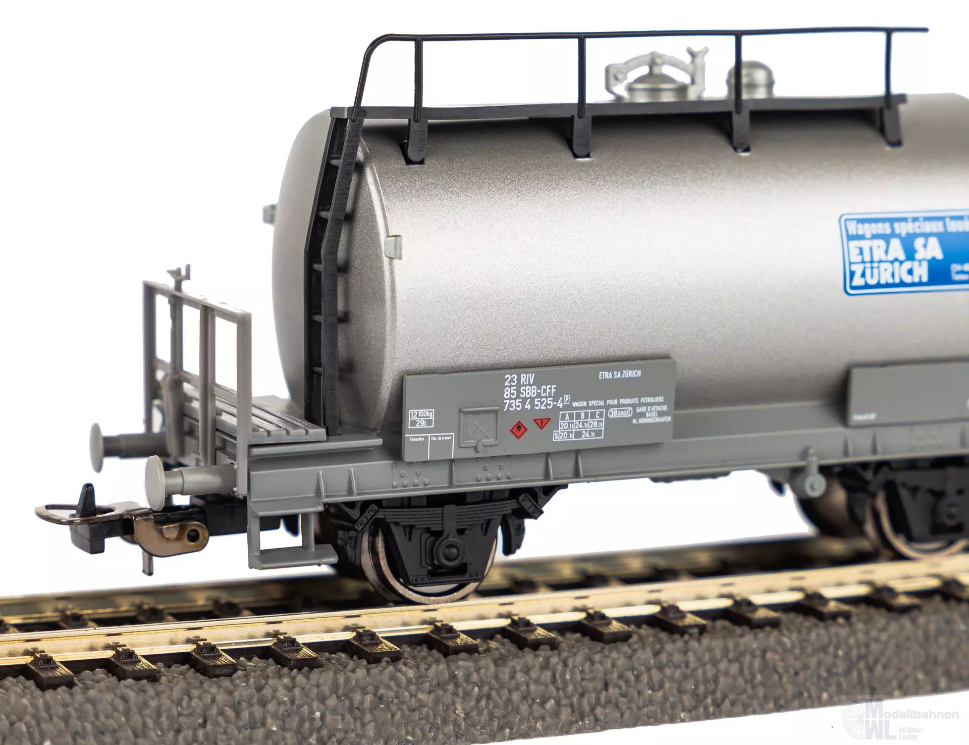 Neuheit 2024: Zweiachsiger Kesselwagen der SBB mit Aufschrift der Etra AG Zürich. Das Modell überzeugt durch seine robuste Bauweise, detaillierte Ausgestaltung und hervorragenden Rolleigenschaften. Bahnverwaltung: SBB Epoche: IV Länge über Puffer: 103 mm Mindestradius: 358 mm Kupplung: NEM Schacht + Kurzkupplungskulisse