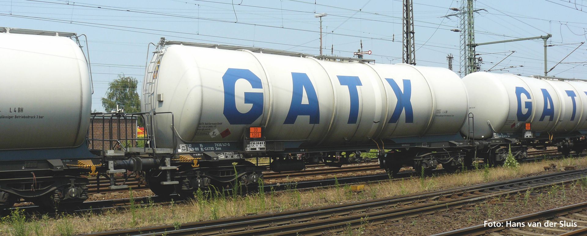 Druckvariante des Knickkesselwagens im Design GATX der NL aus Epoche IV. Das Modell überzeugt durch eine Vielzahl separat angesetzter Elemente, wie Bremserbühne, Laufsteg, Einstellertafen und Bremsgestänge. Wie das Original weisen die Kesselhälften am Knick in der Mitte eine Neigung von 3° auf, sodass der Kesselinhalt ohne Hilfsmittel nahezu restlos ablaufen kann.