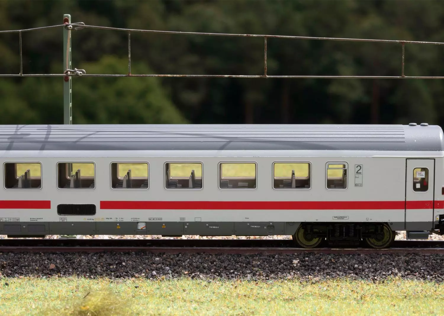 Modell: Serienmäßig eingebaute LED-Innenbeleuchtung und Strom führende Kupplungen. Die Innenbeleuchtung funktioniert im Verbund mit dem IC-Steuerwagen und kann über einen Decoder im Steuerwagen digital ein- und ausgeschaltet werden. Stirnseitig rot transparente Schlusslicht-Einsätze an den Wagenenden. Typspezifisch gestaltete Schürze. Mit Drehgestelle MD ohne Generator. Bauliche Merkmale druckertüchtigter Wagen wie beispielsweise SIG-Übergänge, Einstiegstüren und Fenster. Aufgedruckte Wagenlaufschilder. Befahrbarer Mindestradius 360 mm. Länge über Puffer ca. 28,2 cm.
