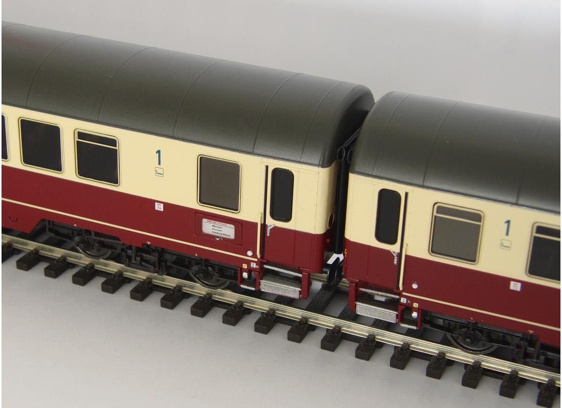 Neukonstruktion des Abteilwagens Avmz 111 der DB in der Epoche IV in beige/rot, Inneneinrichtung und detaillierten Drehgestellen. Der Wagen ist für eine einfache Nachrüstung mit Innenbeleuchtung vorbereitet.