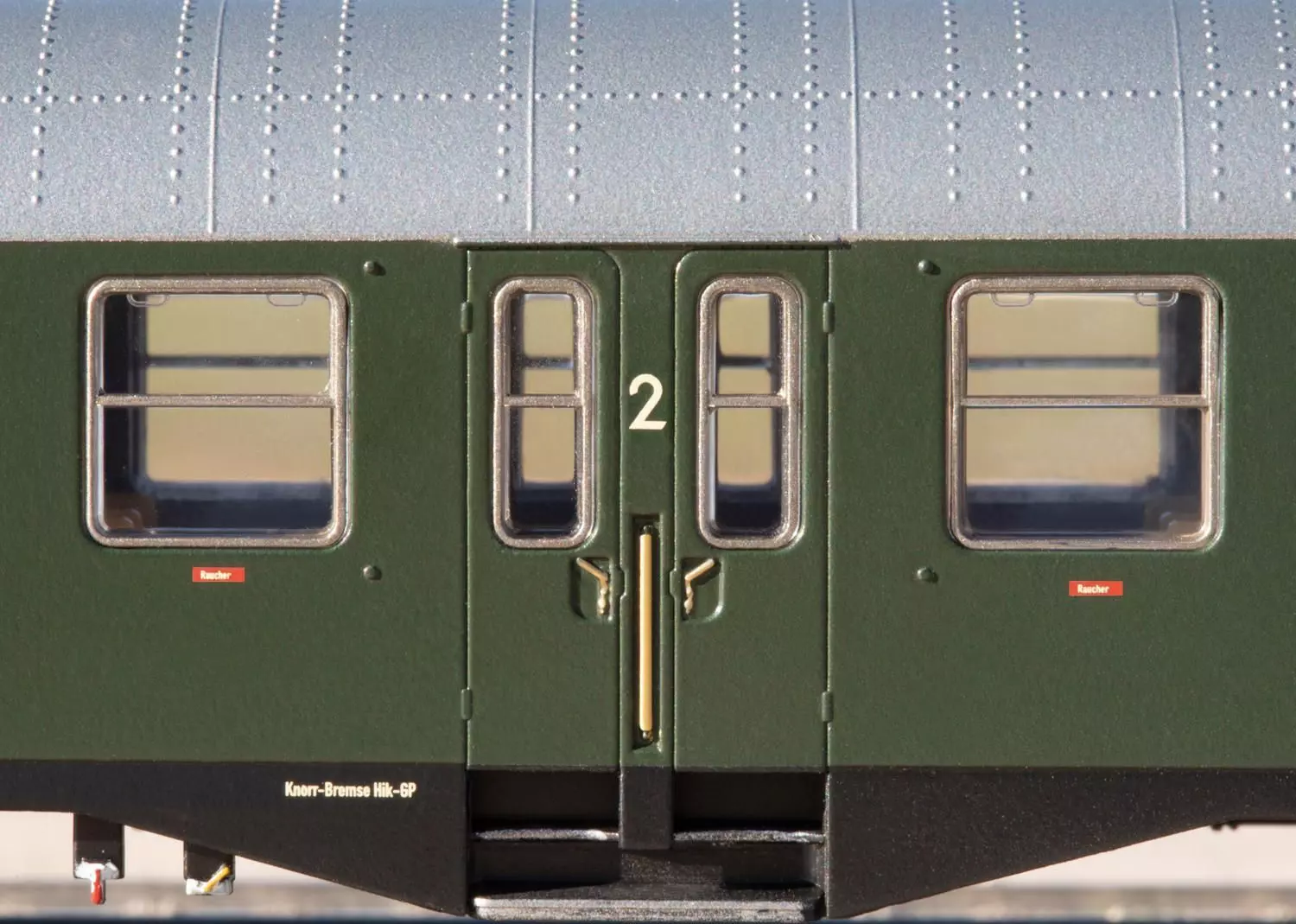 Modell: Serienmäßig eingebaute LED Innenbeleuchtung und Strom führende Kupplungen. Die Innenbeleuchtung funktioniert im Verbund mit dem Mitteleinstiegs-Steuerwagen und kann über einen Decoder im Steuerwagen digital ein- und ausgeschaltet werden. Stirnseitig rot transparente Schlusslicht-Einsätze an den Wagenenden. Typspezifisch gestalteter Unterboden. Drehgestelle Bauart Minden-Deutz schwer mit Doppelklotzbremse. Befahrbarer Mindestradius 360 mm. Für die Präsentation in einer Vitrine liegen WC-Fallrohre und Wendezugsteuerleitungen als separat ansteckbare Teile bei. Länge über Puffer 28,2 cm.