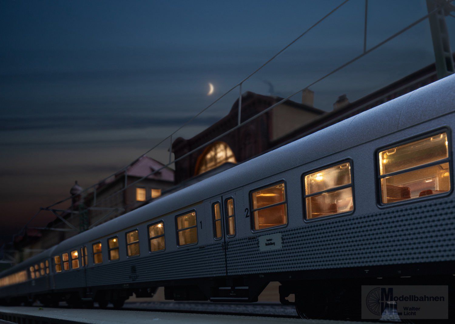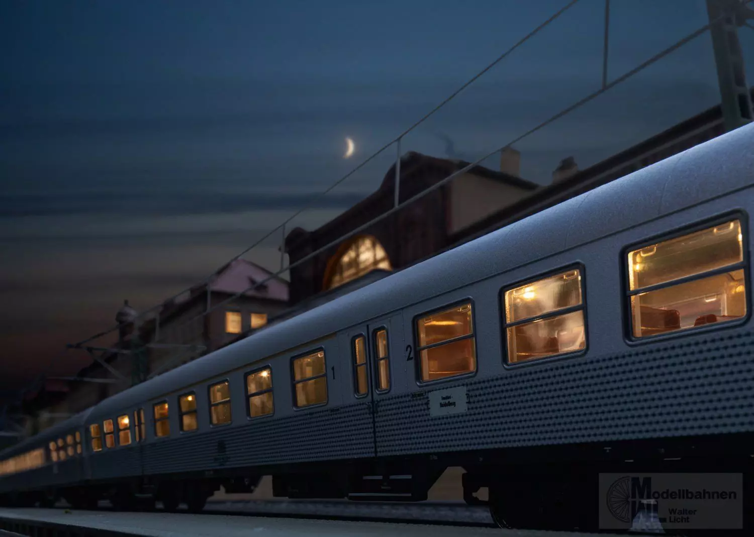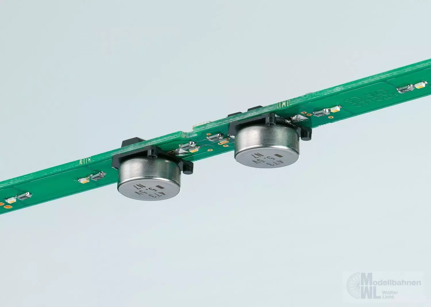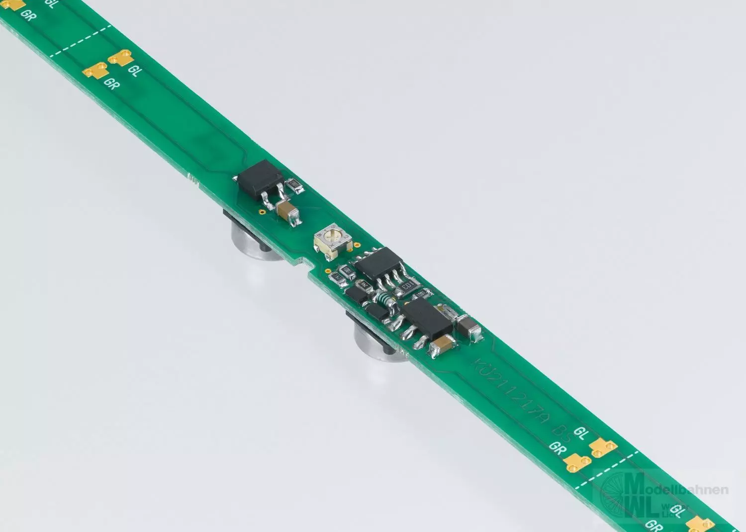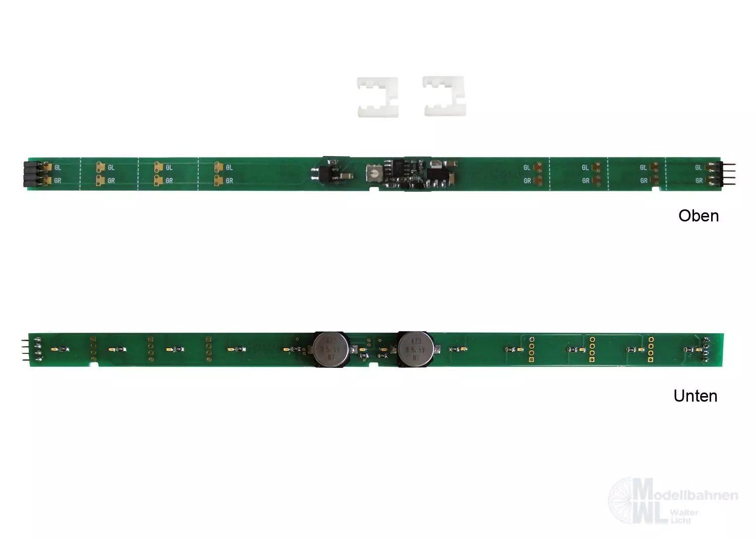 Universal-Platine mit mehreren Leuchtdioden zur Nachrüstung der meisten Personenwagen im Märklin H0-Sortiment. Eingebauter Pufferspeicher ermöglicht einen flackerfreien Betrieb. Helligkeit der Innenbeleuchtung manuell einstellbar. Für kürzere Wagen kann die Platine an mehreren Stellen gekürzt werden. Haltebügel zur Befestigung auf der Inneneinrichtung liegen bei.