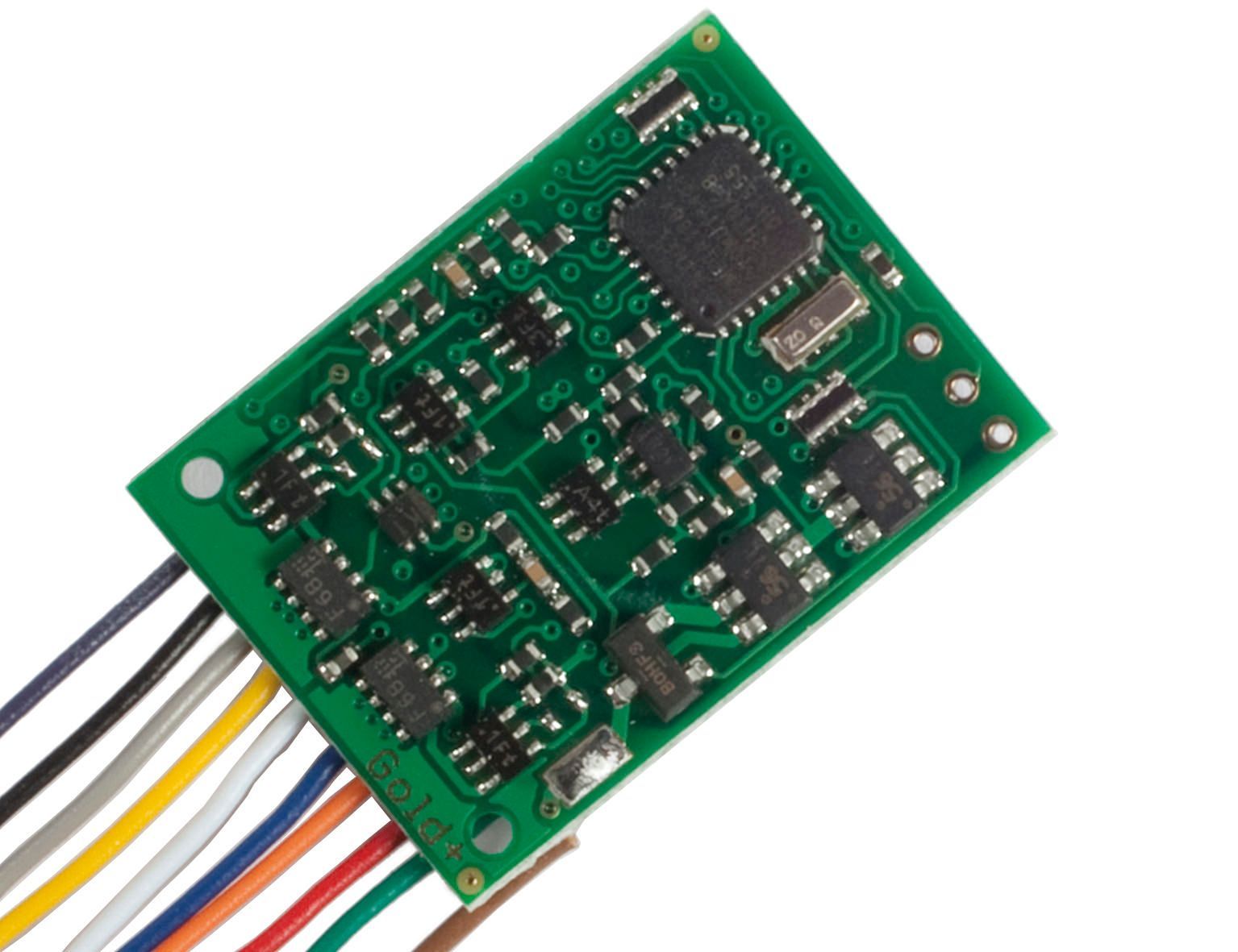 Alle GOLD+ Lokdecoder der neuen Generation sind RailCom-fähig; die RailCom-Funktion ist bereits werkseitig eingeschaltet. Außerdem verfügen alle GOLD+ über die nützliche ABC-Technologie und bieten die Möglichkeit, die intelligente USP-Schaltung zu nutzen.