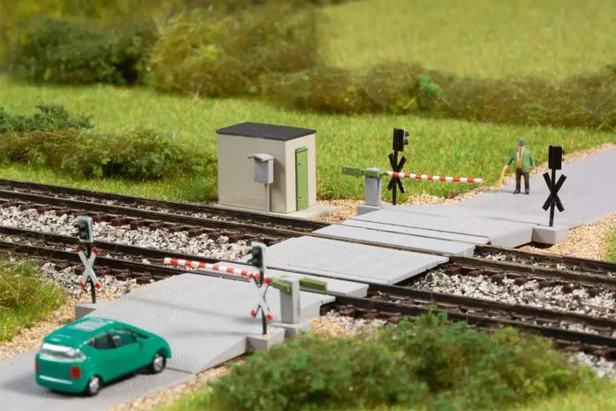 Moderne Ausführung, manuell bedienbar. Durch verschiedene Einlagen für Gleisführung gerade und im Bogen verwendbar. Das Schaltschrankgebäude mit Fernsprecher liegt bei.