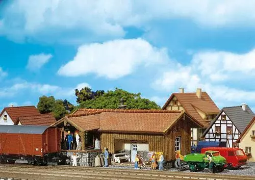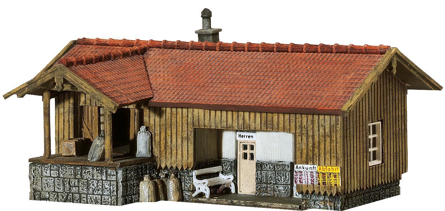 im Baustil einer Nebenstreckenstation, mit kleiner, überdachter Verladerampe.