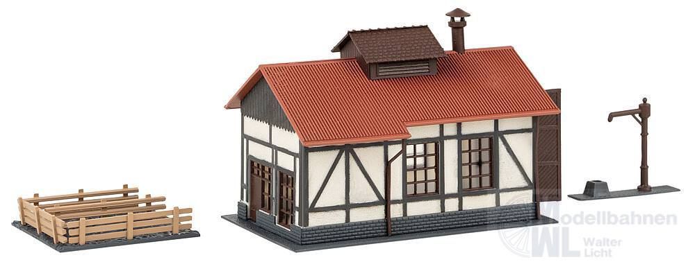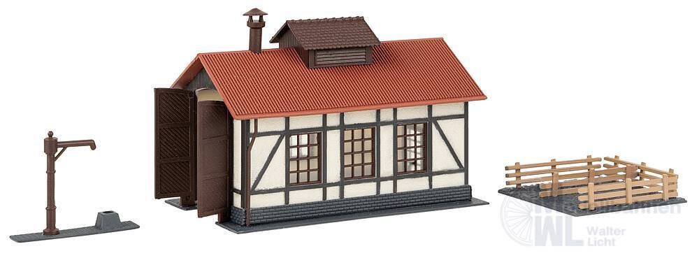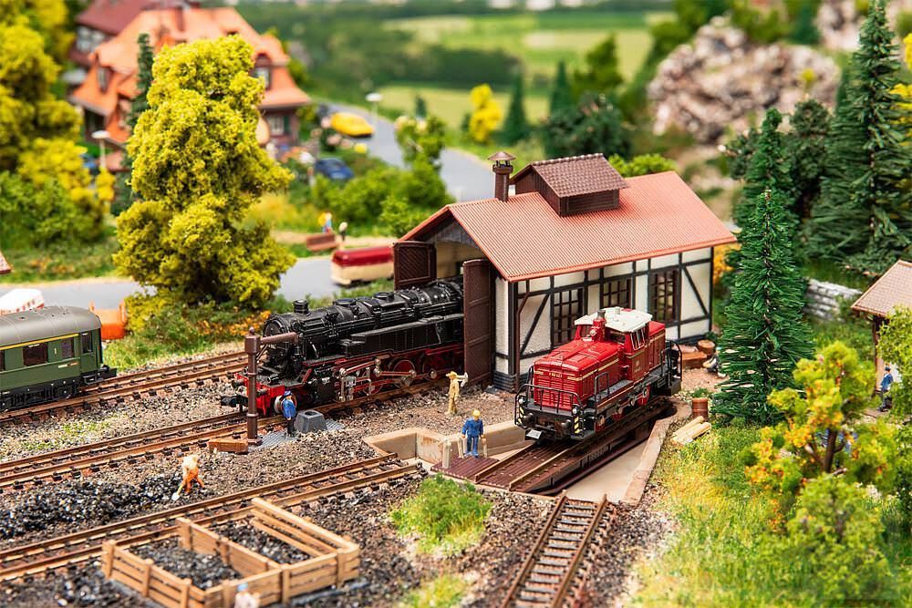 Die funktionsfähige Segmentdrehscheibe mit Servomotor, der kleine restaurierte Lokschuppen mit Fachwerk aus der Epoche II sowie ein Kohlebansen und ein Wasserkran runden das Bild für vielfältige Modellbauszenen auf einer N-Modelleisenbahnanlage ab.