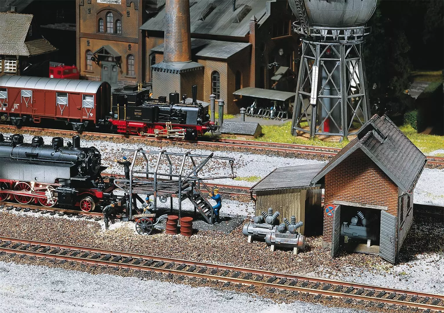 Ein Bausatz zur Ergänzung des Bahnbetriebswerkes in Spur N, bestehend aus einem Lademaß, zwei mit Beheizungsanlagen ausgestatteten Wasserkränen und einem stationären Rohrblasgerüst zum Reinigen der Loks.