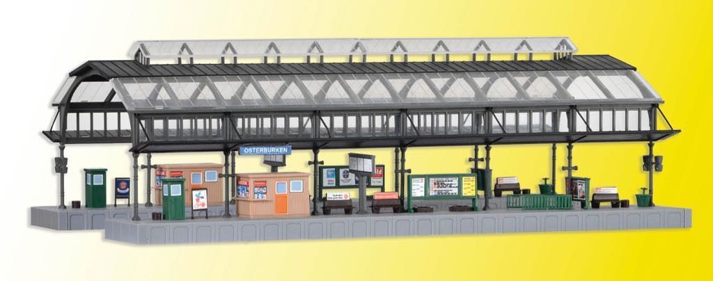 Bausatz. Gleise und Bahnsteige werden hier von einer interessanten Hallenkonstruktion aus Eisen und Glas raumwirksam überspannt. Mehrere Hallen können in beliebiger Länge und Breite hinter- bzw. nebeneinander aufgebaut werden, wobei sie je nach Wunsch oder vorhandener Anlage als Durchgangs- oder Kopfbahnhof eingesetzt werden können. Der Aufbau der gewölbten Dachkonstruktion bereitet im Modell keine Schwierigkeiten, lediglich die Montagereihenfolge der einzelnen Dachteile spielt eine Rolle. Geeignet für den Aufbau mit der Viessmann-Oberleitung. Durchfahrtshöhe: 6,5 cm. Durchfahrtsbreite: 5,5 cm. Maße: L 24 x B 13,2 x H 8 cm. Schwierigkeitsgrad: 2 (Fortgeschrittene).