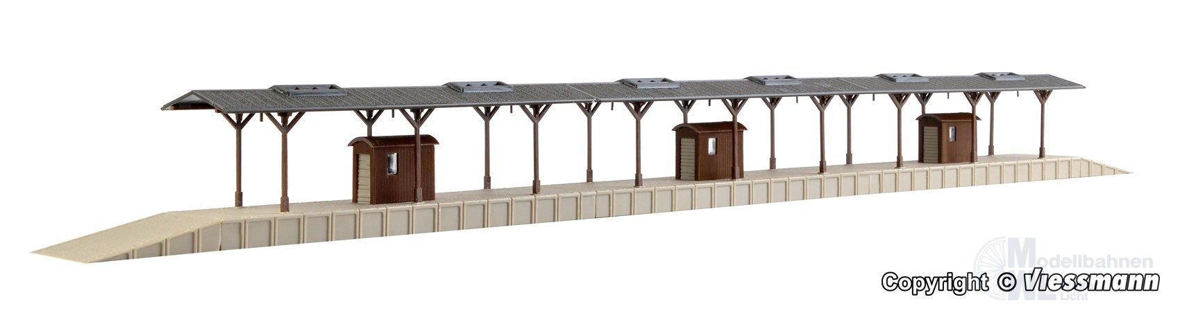Ein Bahnhof besteht nicht nur aus dem Empfangsgebäude. Güterschuppen, Laderampe und Gepäckbahnsteige sind Teile, die nicht fehlen dürfen. Erst sie geben der Bahnhofsanlage das richtige Gesicht. Maße: L 51,8 x B 3,5 x H 4,8 cm. Dachbreite: 4 cm. Bahnsteighöhe: 0,9 cm.