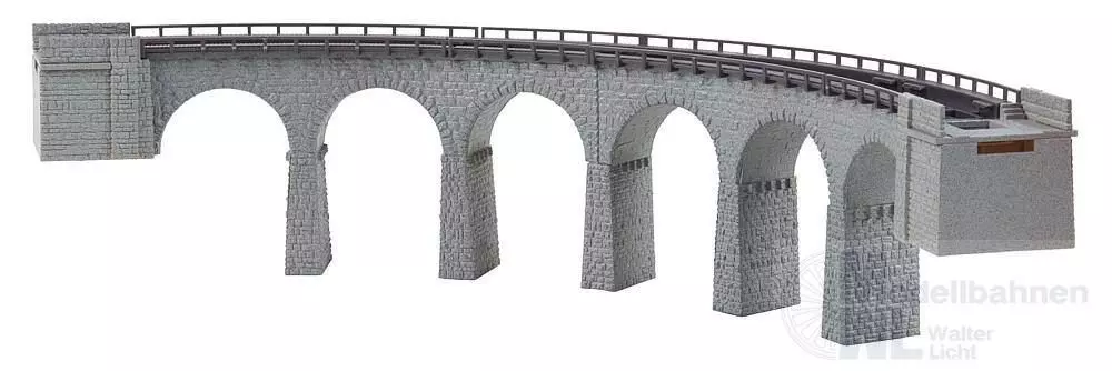 Das gebogene Viadukt besteht aus 2 Brückenteilen mit Gleisbetten, je 45° (auf 30° verkürzbar) und einem mittleren Radius von 193 mm. Die Durchfahrtshöhe mit Pfeilern beträgt 57 mm (6 Pfeiler à 38 mm). Die Brückenteile sind auch einzeln verwendbar. Das Viadukt-Set kann einspurig befahren werden und beinhaltet zudem 2 Tunnelportale, die das Set optimal abschließen.