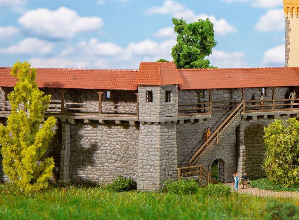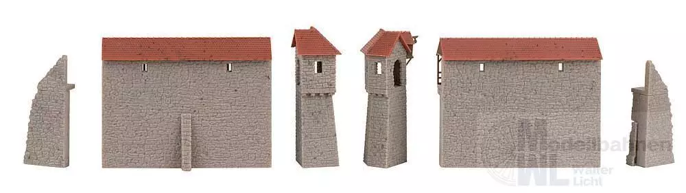 Zwei Wehrtürme, zwei Mauerteile mit gedecktem Wehrgang und zwei Mauerruinen für die Gestaltung einer Altstadtmauer. Variable Anordnung möglich. Kombinierbar mit dem Altstadtturm mit Mauer, Art. 232171.