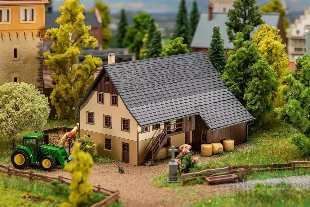 Ein in den typischen braunen Farben gehaltenes Dorfbauernhaus im süddeutschen Stil lädt zur Gestaltung vieler dörflicher Szenen auf der Modelleisenbahnanlage ein. Große hölzerne Tore, an den Wohnbereich angebauter Holzschuppen, außenliegender hölzerner Treppenaufgang und ein lang gezogenes Dach prägen dieses Bauernhaus auf dem Dorf. Kreuze für den Außenbereich und sonstiges passendes Zubehör komplettieren diesen interessanten Bausatz.