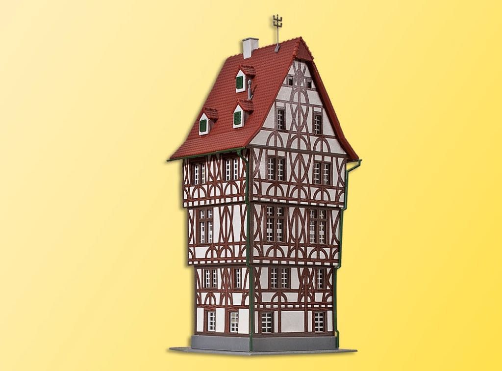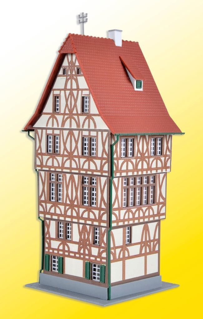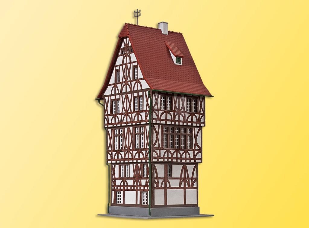 Bausatz. Dieser schlanke Fachwerkbau mit seinen geringen Grundmaßen fügt sich gut in einen dicht bebauten Stadtkern ein. Maße: L 6,5 x B 6 x H 14 cm. Schwierigkeitsgrad: 2 (Fortgeschrittene).