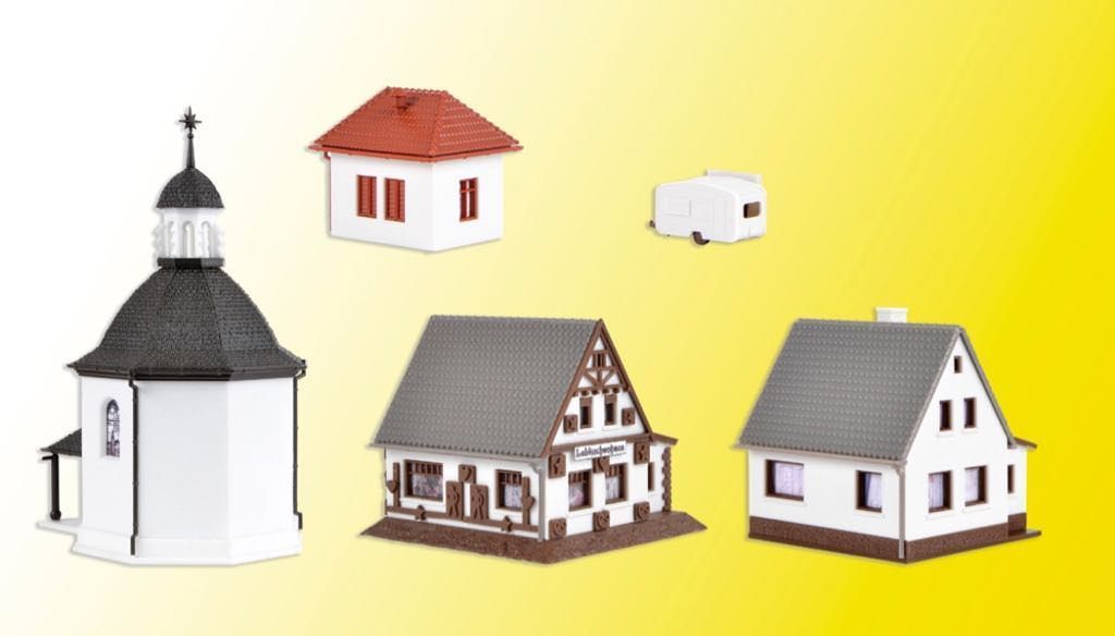 Das Weihnachtsdorf passt hervorragend auf Modellbahnanlagen mit Winterstimmung. Oder gestalten Sie mit Ihren Kindern und Enkeln im Rahmen vorweihnachtlicher Bastelabende ein festliches Diorama. Die Häuser sind auch als Dekoration auf dem Fenster- oder Kaminsims eine Augenweide. Das Dorf besteht aus der Stille-Nacht-Gedächtniskapelle, einem Postamt Christkindl, Glühweinstand, Lebkuchenhaus und Bratwurst-Maxe. Der Kapelle, dem Postamt und dem Lebkuchenhaus liegt jeweils eine Sockelbirne für die Innenbeleuchtung bei. Außerdem ein Tütchen Kunstschnee zur Gestaltung der winterlichen Atmosphäre. Maße: Kapelle L 5,5 x B 7,5 x H 10,3 cm, Postamt L 5,3 x B 5,6 x H 5,6 cm, Lebkuchenhaus L 6 x B 5,9 x H 5,1 cm, Bratwurst-Maxe L 4,1 x B 4,1 x H 3,8 cm, Glühweinstand L 3,2 x B 1,7 x H 1,8 cm.