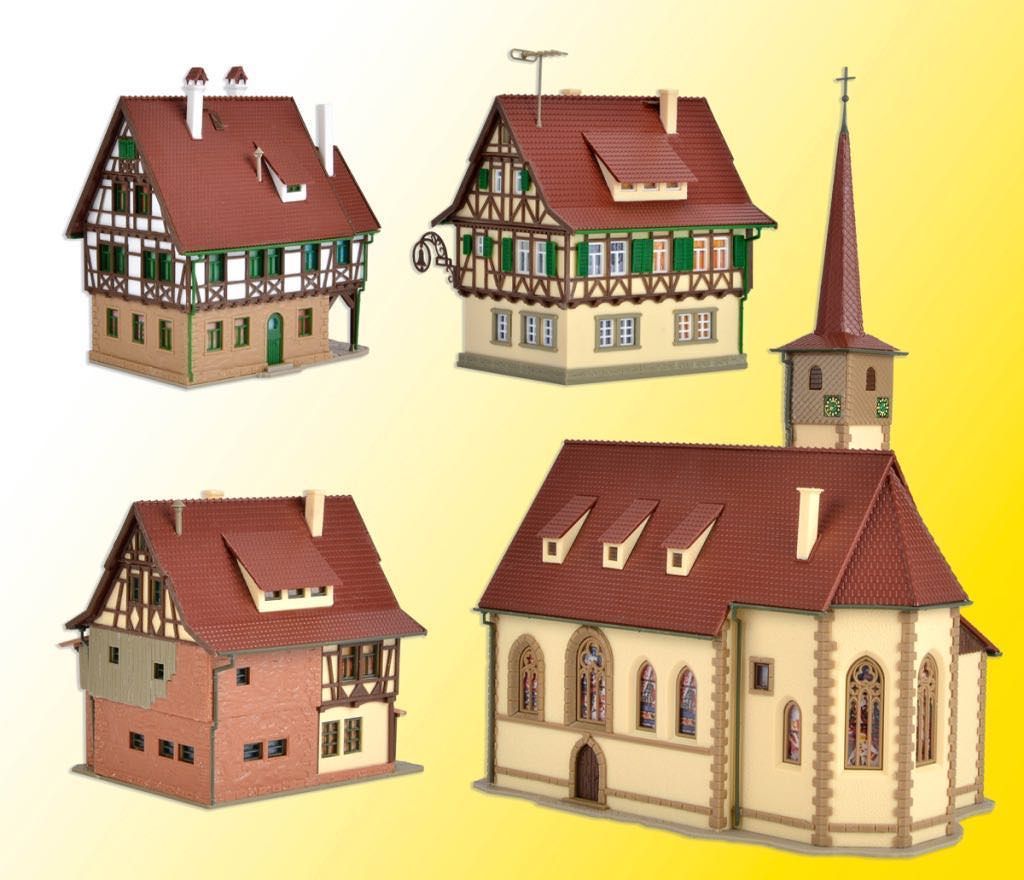 Dieses Set besteht aus der Kirche, dem Gasthaus und 2 Fachwerkhäusern. Maße: Kirche L 15,8 x B 9,8 x H 21,7 cm, Gasthaus L 8,3 x B 8,5 x H 9,5 cm, Tor L 4 x B 0,8 x H 3,5 cm, Fachwerkhaus L 10 x B 6,8 x H 10,5 cm, Fachwerkhaus L 9 x B 8,5 x H 8,5 cm, Tor L 4 x B 0,4 x H 3 cm.