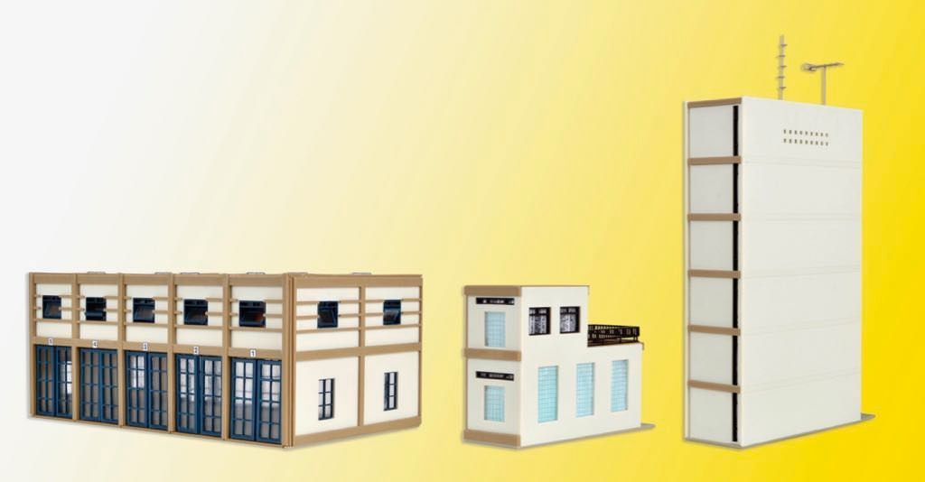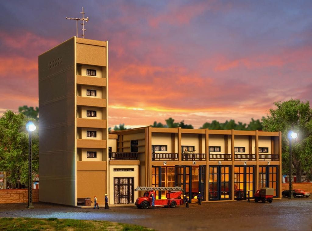 Dieses Feuerwehrgebäude der Epochen III und IV bietet in der Fahrzeughalle mit dem für diese Zeit typischen Flachdach Platz für 5 Einsatzfahrzeuge. Im schmalen Anbau sind Seminar- und Aufenthaltsräume untergebracht. Maße: L 17 x B 10,5 x H 7,5 cm, L 3,4 x B 10,5 x H 18,5 cm, L 3,2 x B 10,5 x H 6,8 cm.