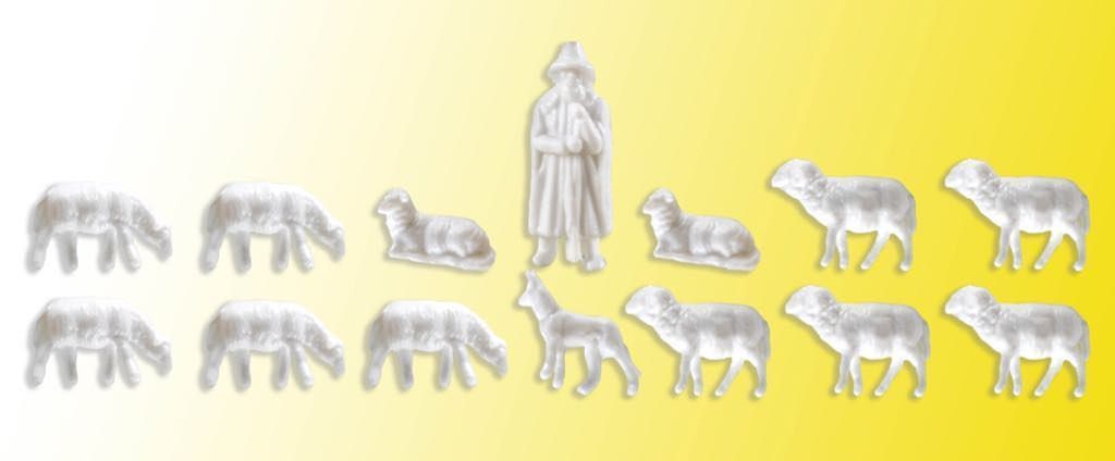 Mit Zaun, unbemaltem Schäfer, Hund und 12 Schafen. Maße: Gebäude L 10,5 x B 7,5 x H 8 cm, Zaun L 32 x B 0,1 x H 0,9 cm.