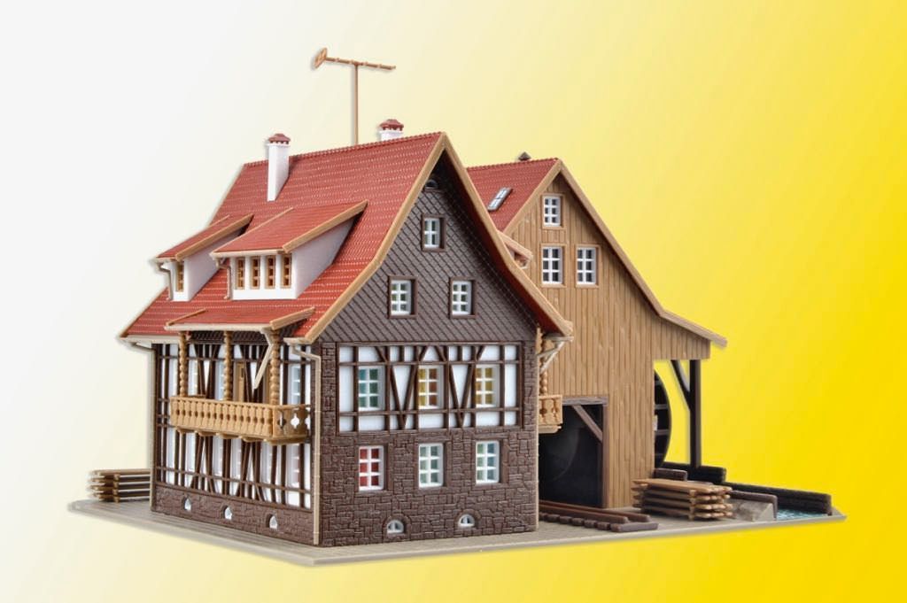 An der Rückseite dieses schmucken Fachwerkhauses ist ein Sägewerk angebaut. Umfangreiches Zubehör ermöglicht eine realistische Ausgestaltung. Das Mühlrad kann mit dem Motor Art. 44200 angetrieben werden (Zusatzausstattung). Maße: L 17 x B 15,5 x H 12 cm
