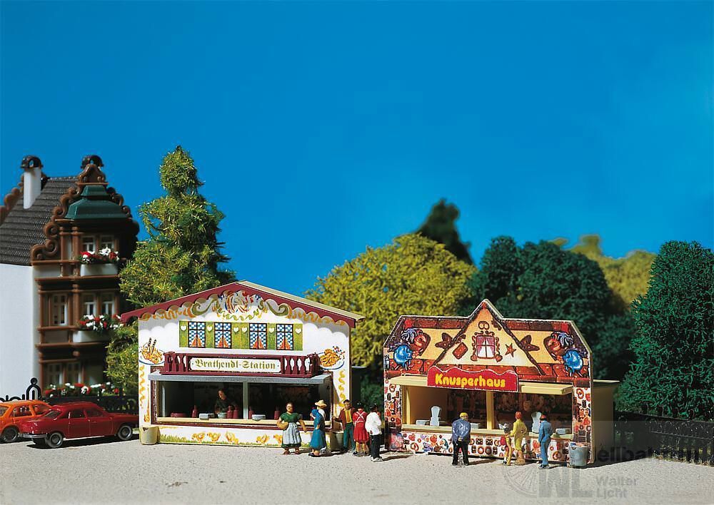 2 weitere Buden, als Knusperhäuschen und Brathendl-Station zu gestalten. Es liegen Frontdekorbilder und Ausschmückungsteile bei. Die Stände sind mit Art. 180671 beleuchtbar.