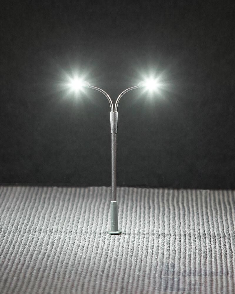 Moderne Peitschenleuchte mit zwei Auslegern. Besonders geeignet zur Ausgestaltung von Stadt-, Straßen- und Industrieszenerien. Der Mast ist aus Metall gefertigt und die Leuchtenhöhe variabel einstellbar. Die filigrane zweiflammige Leuchte ist mit langlebiger LED-Technik ausgestattet. Höhe: 65 mm.