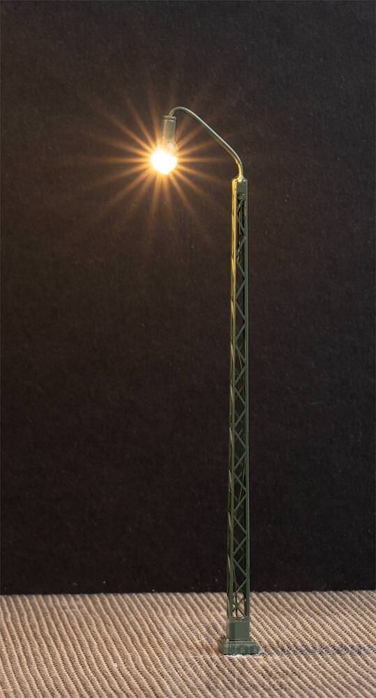 Klassische Bogenleuchte mit Gittermast aus Metall. Besonders geeignet zur Beleuchtung von bahnnahen Szenerien, wie Bahnhöfen, Betriebswerken oder Gleisfeldern. Die einflammige Leuchte ist mit langlebiger LED-Technik ausgestattet. Höhe: 117 mm.