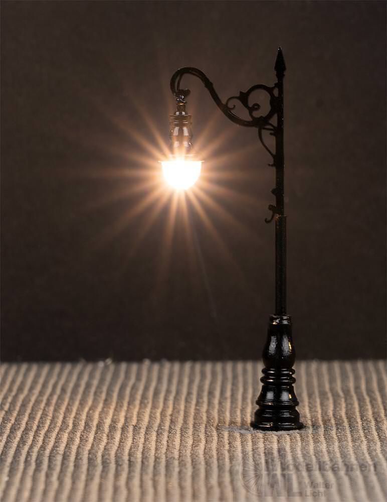 Modell einer historischen, schmiedeeisernen Laterne. Die filigran ausgeführten Verzierungen verleihen dieser Laterne besonderen Charme. Damit eignet sie sich im besonderen Maße zur Beleuchtung von Altstädten, Parks und historischen Szenerien. Der Mast ist aus Metall gefertigt und die Leuchtenhöhe variabel einstellbar. Die einflammige Laterne ist mit langlebiger LED-Technik ausgestattet. Höhe: 65 mm.