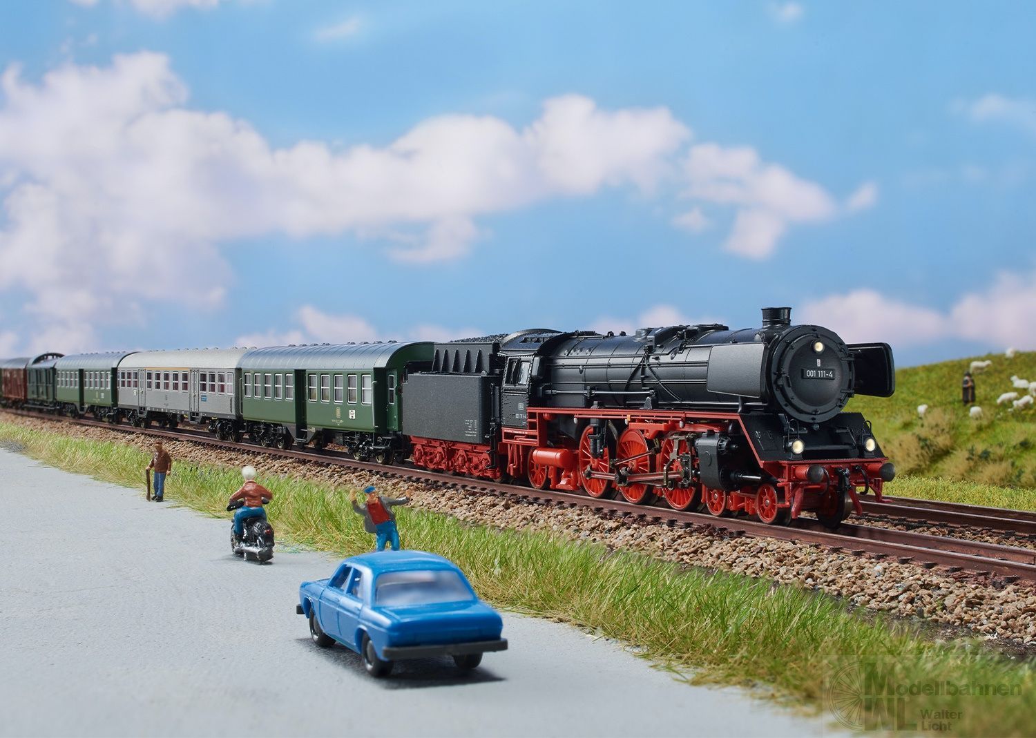 Vorbild: Schnellzug-Dampflokomotive 001 111-4 der Deutschen Bundesbahn (DB). Betriebszustand um 1972. Ausführung mit Altbaukessel, geschlossener Frontschürze und Windleitblechen der Bauart "Witte".