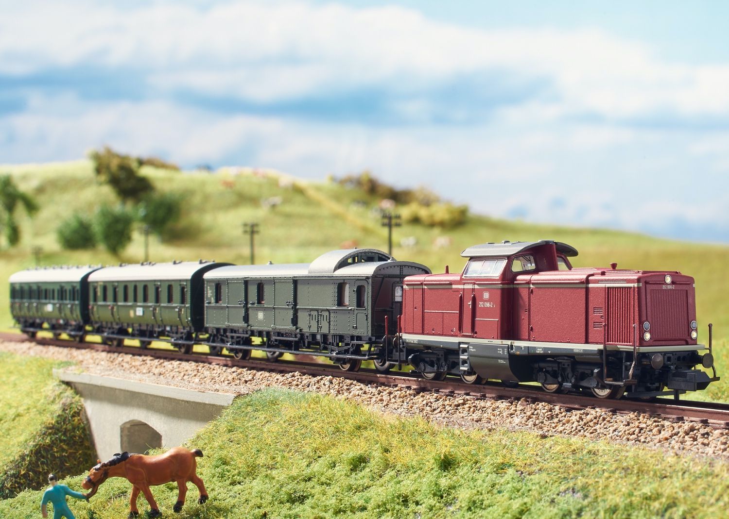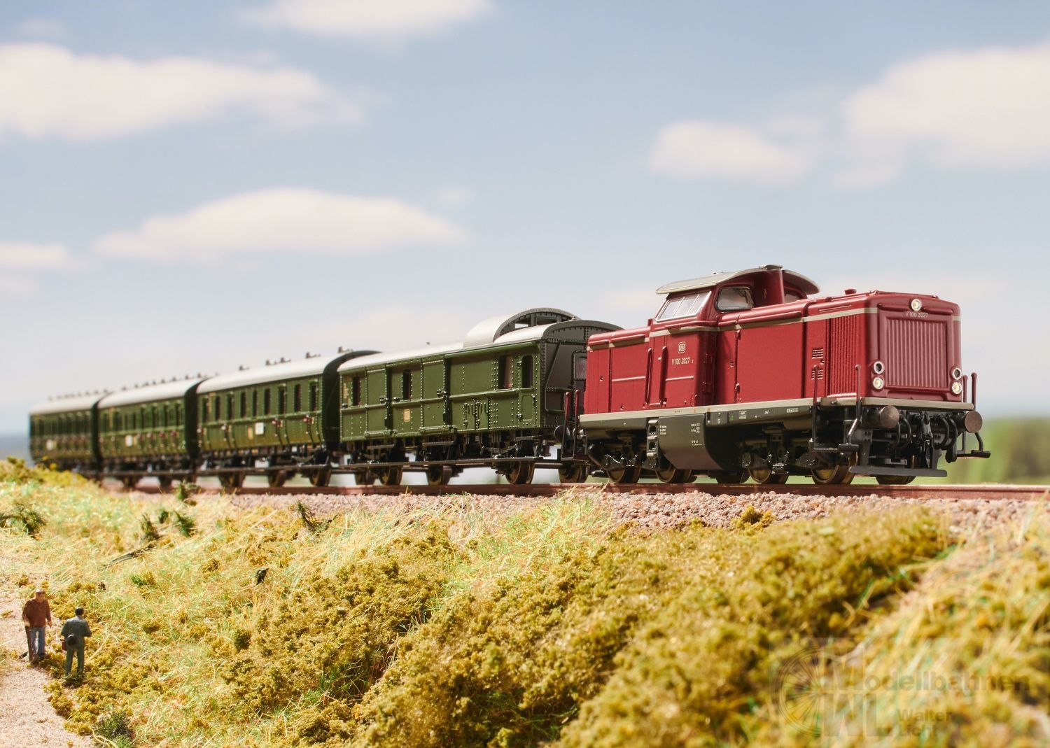 Diesellokomotive V 100 2027 der Deutschen Bundesbahn (DB). Ausführung in Purpurrot der Epoche III.Einsatz: Personen- und Güterzüge.