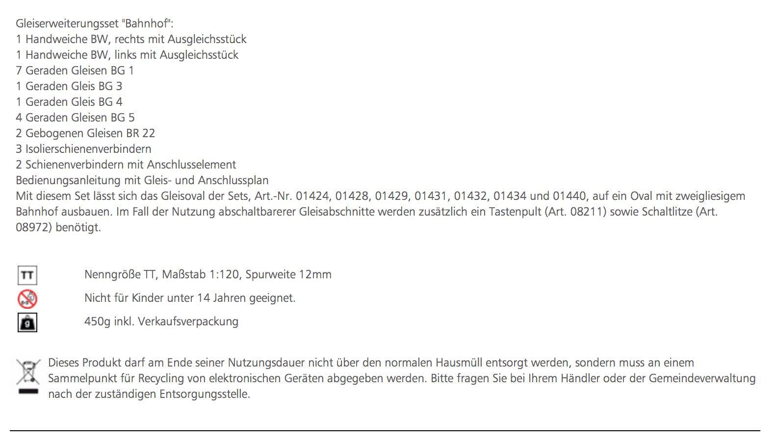 Mit diesem Set lässt sich das Gleisoval der Sets, Art.-Nr. 01424, 01428, 01429, 01431, 01432, 01434 und 01440, auf ein Oval mit zweigliesigem Bahnhof ausbauen. Im Fall der Nutzung abschaltbarerer Gleisabschnitte werden zusätzlich ein Tastenpult (Art. 08211) sowie Schaltlitze (Art. 08972) benötigt.